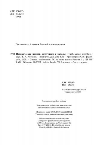 Библиографическое описание:Историческая память: источники и методы : учебно-методическое пособие / Сибирский федеральный университет, Гуманитарный институт ; сост. Е. А. Ахтамов. - Электрон. текстовые дан. (pdf, 0,9 Мб). - Красноярск : СФУ, 2020 (2020-05-29). - 17 с. - Загл. с титул. экрана. - Изд. № 2020-11362 : Б. ц. - Текст : электронный.