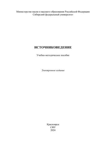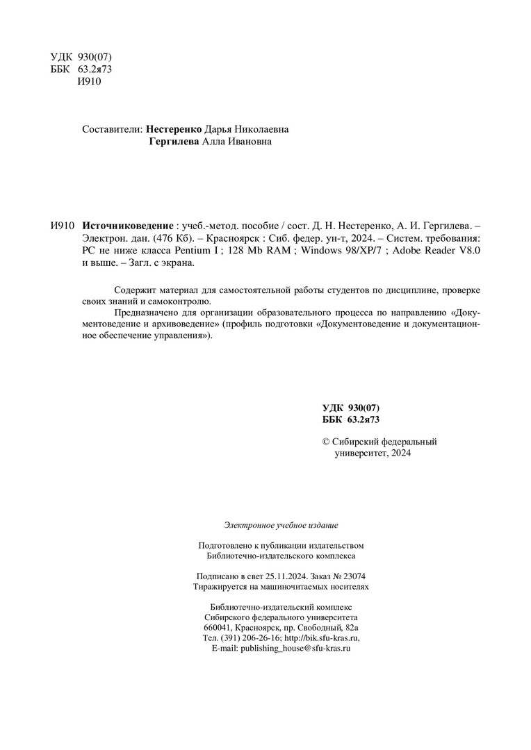 Библиографическое описание: Источниковедение : учебно-методическое пособие / Сибирский федеральный университет, Гуманитарный институт ; сост.: Д. Н. Нестеренко, А. И. Гергилева. - Электрон. текстовые дан. (pdf, 0,5 Мб). - Красноярск : СФУ, 2024 (2024-11-25). - 17 с. - Загл. с титул. экрана. - Изд. № 2024-23074 : Б. ц. - Текст : электронный.