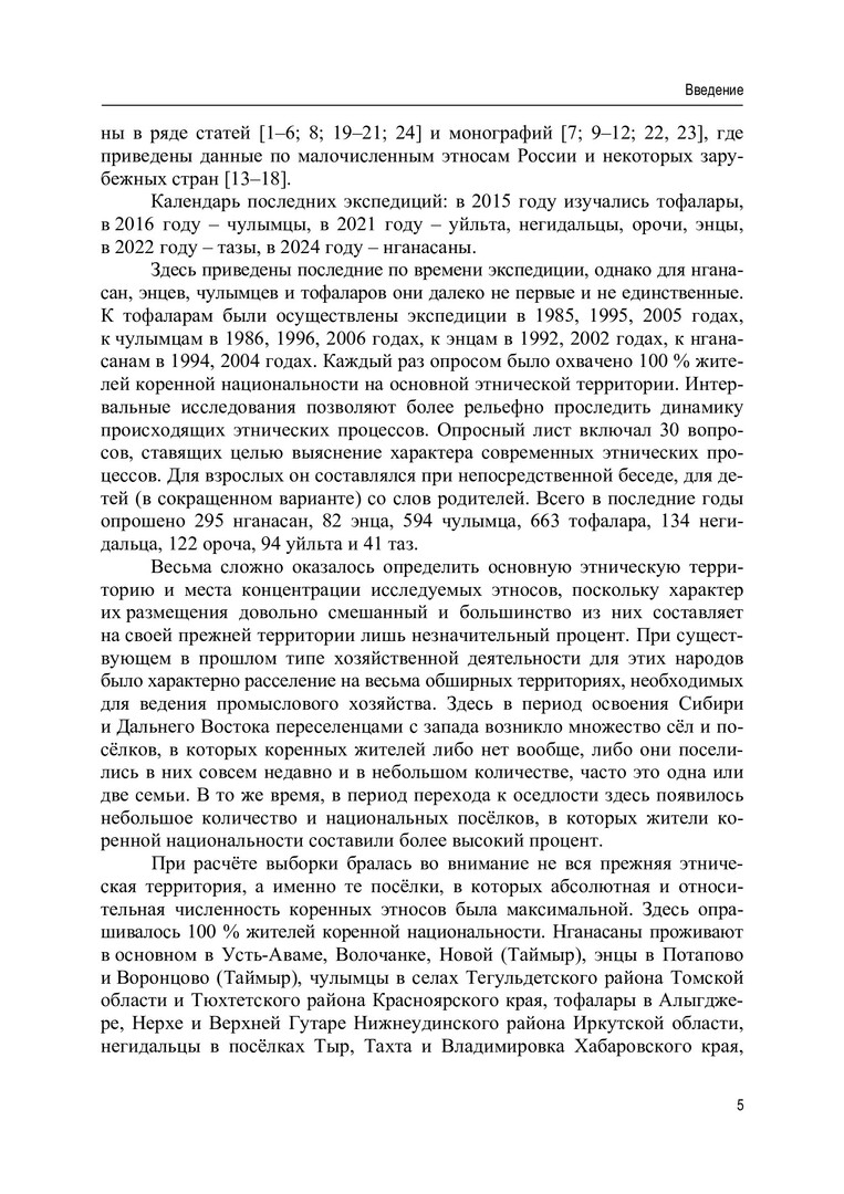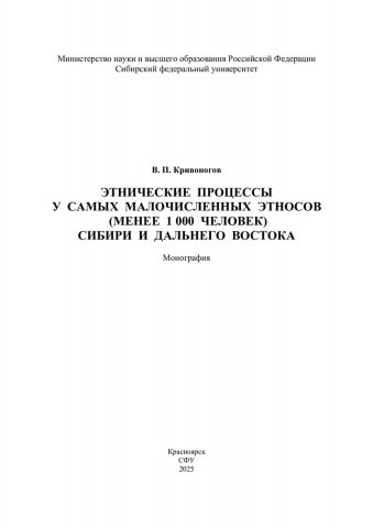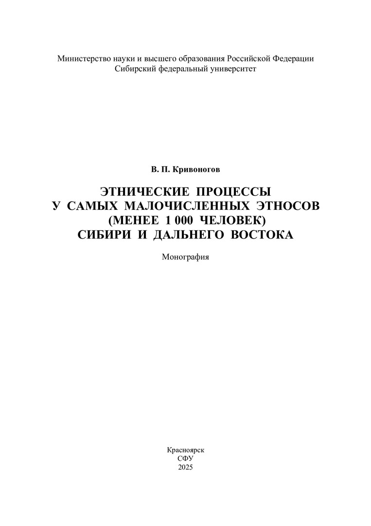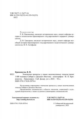 Библиографическое описание: Кривоногов, Виктор Павлович. Этнические процессы у самых малочисленных этносов (менее 1000 человек) Сибири и Дальнего Востока : монография / В. П. Кривоногов ; рец.: Р. В. Павлюкевич, Д. В. Григорьев ; Сибирский федеральный университет, Гуманитарный институт. - Электрон. текстовые дан. (pdf ; 3,3 Мб). - Красноярск : СФУ, 2025 (2025-05-21). - 92 с., 5.8 усл. печ. л. : табл., граф., фот. - Загл. с титул. экрана. - Электрон. версия печ. публикации . - Библиогр.: с. 86-88. - 500 экз. - ISBN 978-5-7638-5079-6 : Б. ц. - Изд. № 2024-23536. - Текст : электронный.