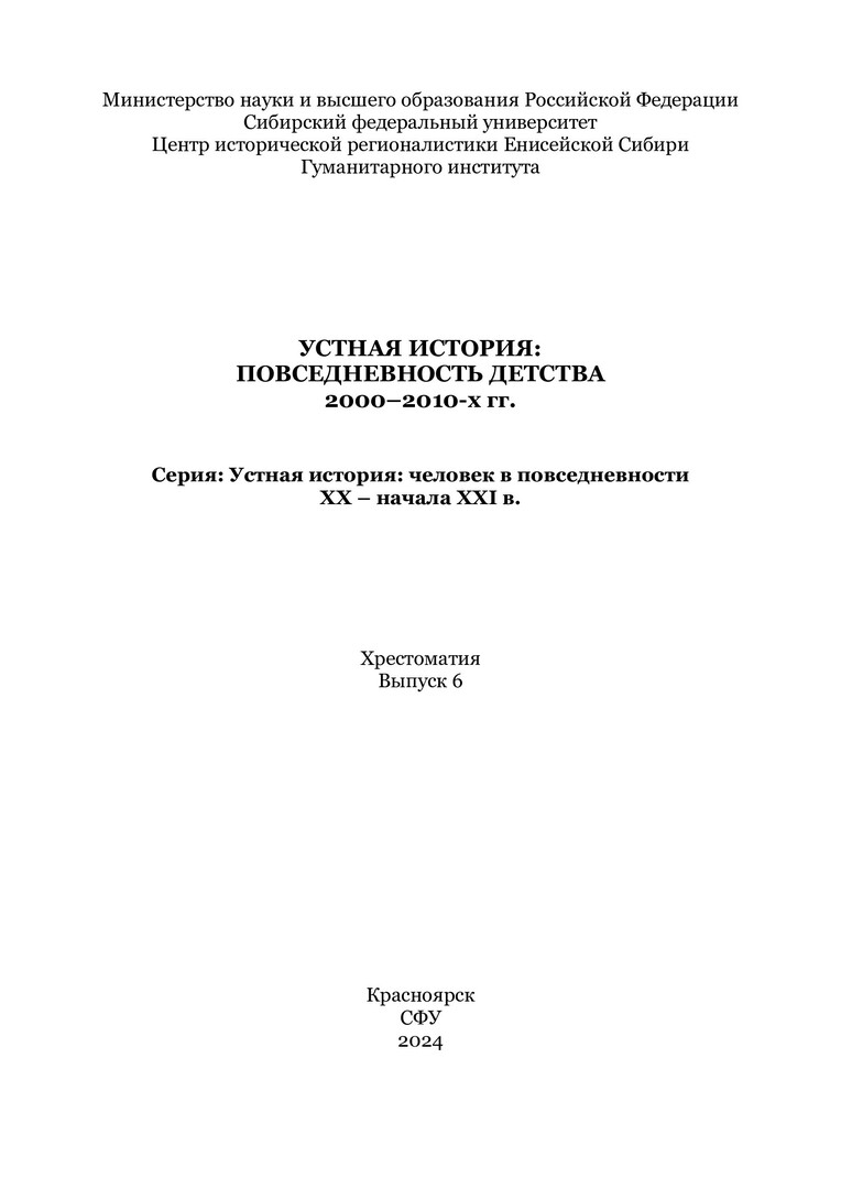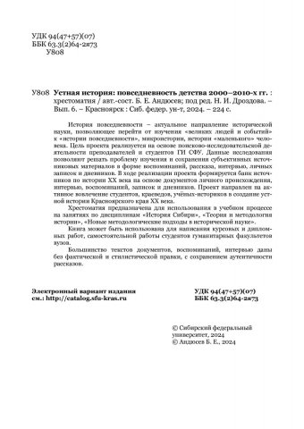 Аннотация: История повседневности – актуальное направление исторической науки, позволяющее перейти от изучения «великих людей и событий» к «истории повседневности», микроистории, истории «маленького» человека. Цель проекта реализуется на основе поисково-исследовательской деятельности преподавателей и студентов ГИ СФУ. Данные исследования позволяют решать проблему изучения и сохранения субъективных источниковых материалов в форме воспоминаний, рассказа, интервью, личных записок и дневников. В ходе реализации проекта формируется банк источников по истории ХХ века на основе документов личного происхождения, интервью, воспоминаний, записок и дневников. Проект направлен на активное вовлечение студентов, краеведов, учёных-историков в создание устной истории Красноярского края ХХ века. Хрестоматия предназначена для использования в учебном процессе на занятиях по дисциплинам «История Сибири», «Теория и методология истории», «Новые методологические подходы в исторической науке». Книга может быть использована для написания курсовых и дипломных работ, самостоятельной работы студентов гуманитарных факультетов вузов. Большинство текстов документов, воспоминаний, интервью даны без фактической и стилистической правки, с сохранением аутентичности рассказов.