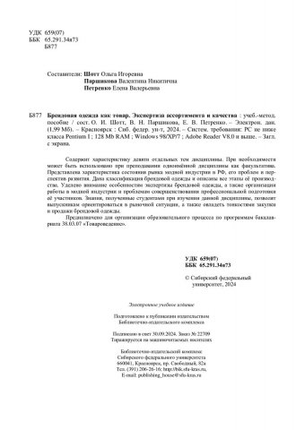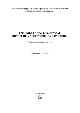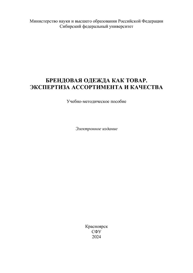 Библиографическое описание: Брендовая одежда как товар. Экспертиза ассортимента и качества : учебно-методическое пособие / Сиб. федер. ун-т, Ин-т торговли и сферы услуг ; сост.: О. И. Шотт, В. Н. Паршикова, Е. В. Петренко. - Электрон. текстовые дан. (pdf, 2 Мб). - Красноярск : СФУ, 2024 (2024-09-30). - 171 с. - Загл. с титул. экрана. - Изд. № 2024-22709 : Б. ц. - Текст : электронный.