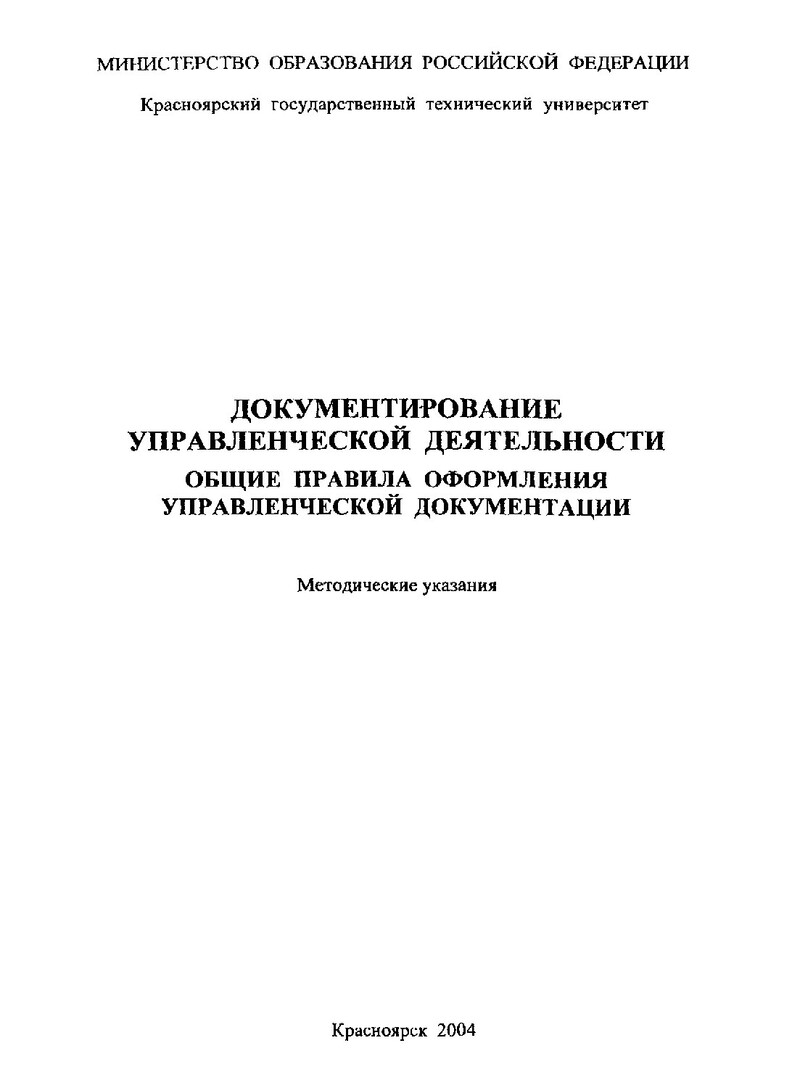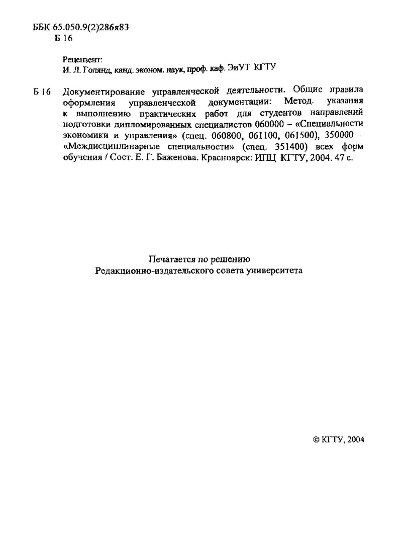 Библиографическое описание:Баженова, Елена Григорьевна. Документирование управленческой деятельности. Общие правила оформления управленческой документации : метод. указ. к выполнению практ. работ для студентов направлений подгот. дипломир. спец. 060000, 350000 всех форм обучения / Е. Г. Баженова ; Краснояр. гос. техн. ун-т. - Красноярск : ИПЦ КГТУ, 2004. - 47 с. - Текст : непосредственный + Текст : электронный.