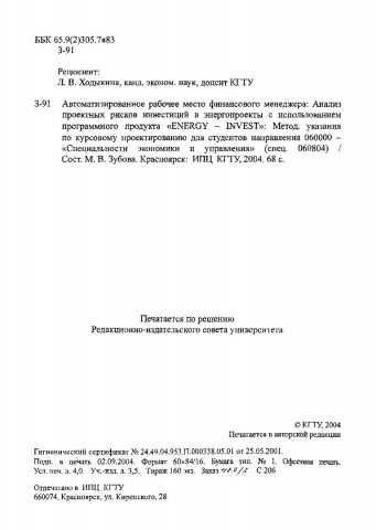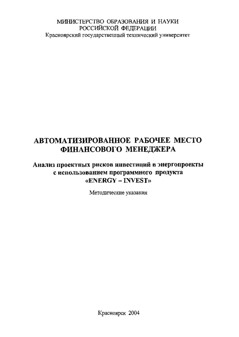 Автоматизированное рабочее место финансового менеджера. Анализ проектных рисков инвестиций в энергопроекты с использованием программного продукта "ENERGY-INVEST" : метод. указ. по курсовому проектированию для студентов направления 060000