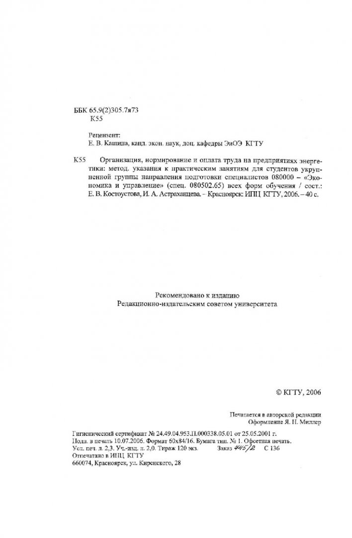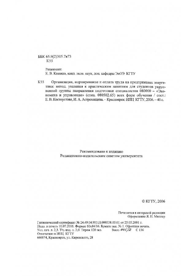 Библиографическое описание:Костоустова, Е. В. Организация, нормирование и оплата труда на предприятиях энергетики : метод. указ. к практическим занятиям для студентов укрупненной группы направления подготовки спец. 080000 (спец. 080502.65) всех форм обучения / Е. В. Костоустова, И. А. Астраханцева ; Краснояр. гос. техн. ун-т. - Красноярск : ИПЦ КГТУ, 2006. - 40 с. - (Учебно-методическая литература). - 120 экз. - 23.00 р. - Текст : непосредственный + Текст : электронный.