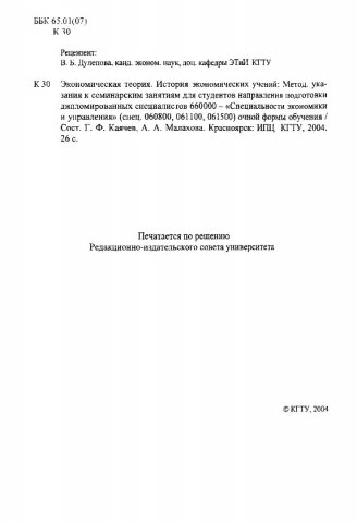 Библиографическое описание:Каячев, Геннадий Федорович. Экономическая теория. История экономических учений : метод. указ. к семинарским занятиям для студентов направления подгот. дипломир. спец. 660000 очной формы обучения / Г. Ф. Каячев, А. А. Малахова ; Краснояр. гос. техн. ун-т. - Красноярск : ИПЦ КГТУ, 2004. - 26 с. - (Учебно-методическая литература). - 300 экз. - Текст : непосредственный + Текст : электронный.