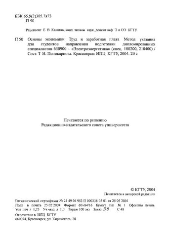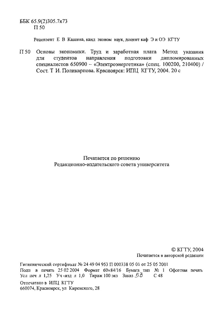 Библиографическое описание:Поликарпова, Татьяна Ивановна. Основы экономики. Труд и заработная плата : метод. указ. для студентов направления подготовки дипломир. спец. 650900- "Электроэнергетика" (спец. 100200, 210400) / Т. И. Поликарпова ; Краснояр. гос. техн. ун-т. - Красноярск : ИПЦ КГТУ, 2004. - 20 с. - Текст : непосредственный + Текст : электронный.
