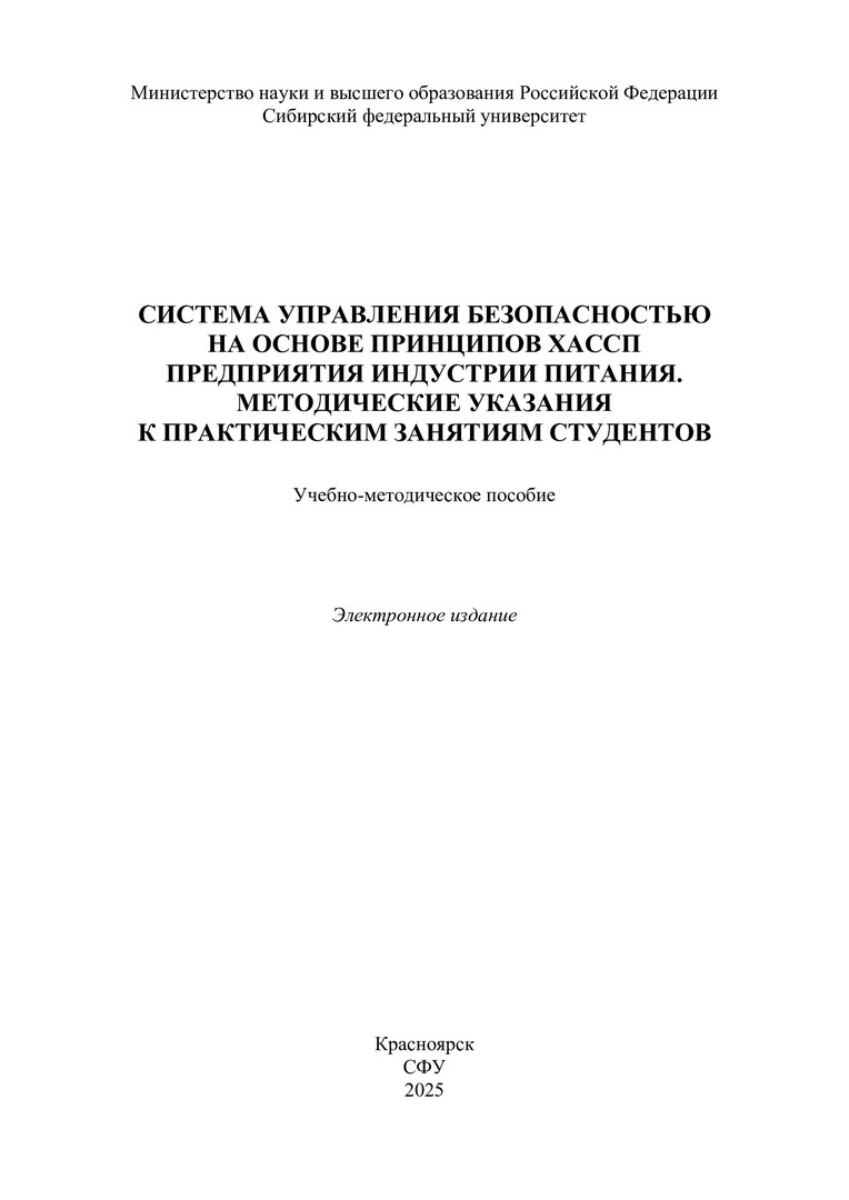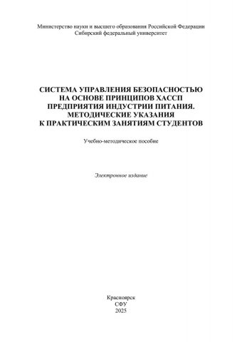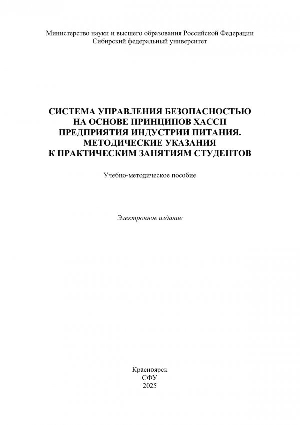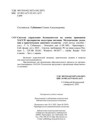 Библиографическое описание:Система управления безопасностью на основе принципов ХАССП предприятия индустрии питания : методические указания к практическим занятиям студентов : учебно-методическое пособие / Сибирский федеральный университет, Институт торговли и сферы услуг ; сост. Г. А. Губаненко. - Электрон. текстовые дан. (pdf, 2 Мб). - Красноярск : СФУ, 2025 (2025-11-10). - 65 с. - Загл. с титул. экрана. - Библиогр.: с. 59. - Изд. № 2025-25474 : Б. ц. - Текст : электронный.