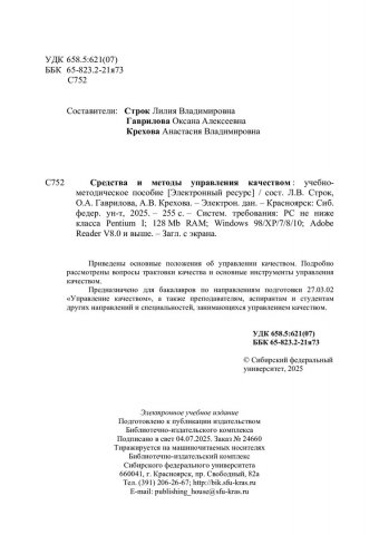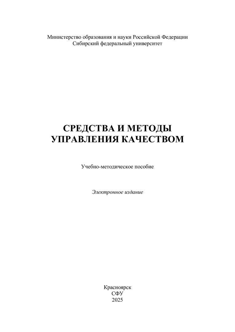 Библиографическое описание: Средства и методы управления качеством : учебно-методическое пособие / Сибирский федеральный университет, Политехнический институт ; сост.: Л. В. Строк, О. А. Гаврилова, А. В. Крехова. - Электрон. текстовые дан. (pdf, 5,3 Мб). - Красноярск : СФУ, 2025. - 255 с. - Загл. с титул. экрана. - Библиогр.: с. 254-255. - Изд. № 2025-24660 : Б. ц. - Текст : электронный.