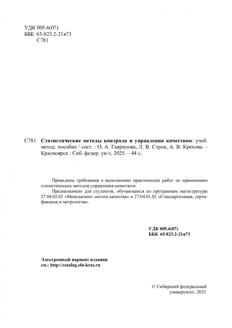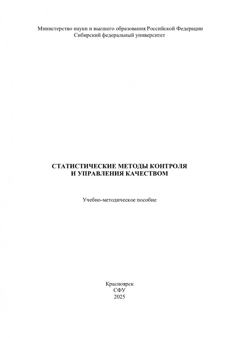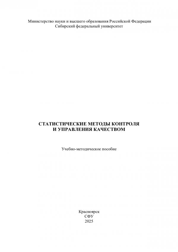 Библиографическое описание:Статистические методы контроля и управления качеством : учебно-методическое пособие / Сибирский федеральный университет, Политехнический институт ; сост.: О. А. Гаврилова, Л. В. Строк, А. В. Крехова. - Электрон. текстовые дан. (pdf, 4.2 Мб). - Красноярск : СФУ, 2025 (2025-11-14). - 44 с. : ил., табл. - Загл. с титул. экрана. - Электрон. версия печ. публикации . - Библиогр.: с. 42-43. - 100 экз. - Изд. № 2025-25359 : Б. ц. - Текст : электронный.