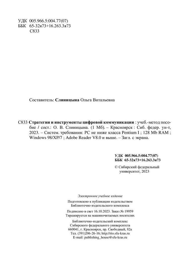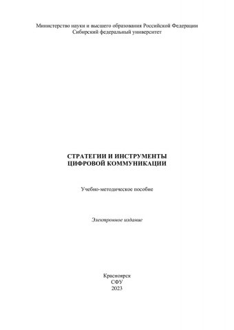 Библиографическое описание: Стратегии и инструменты цифровой коммуникации : учебно-методическое пособие / Сиб. федер. ун-т, Ин-т упр. бизнес-процессами ; сост. О. В. Слиницына. - Электрон. текстовые дан. (pdf, 1 Мб). - Красноярск : СФУ, 2023 (2023-10-16). - 32 с. - Загл. с титул. экрана. - Изд. № 2023-19959 : Б. ц. - Текст : электронный.
