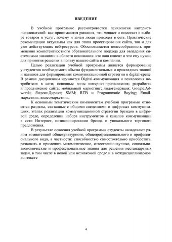 Аннотация: В учебной программе рассматривается психология интернет-пользователей: как принимаются решения, что мешает и помогает в выборе товаров и услуг, почему и зачем люди приходят в сеть. Практические рекомендации актуальны как для этапа проектирования сайта, так и для уже действующих веб-ресурсов. Целью реализации учебной программы является формирование у студентов необходимого объема фундаментальных и прикладных знаний и навыков для формирования коммуникационной стратегии в digital-среде.