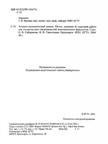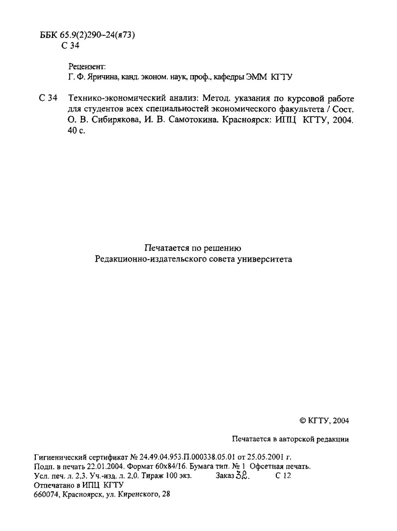 Библиографическое описание:Сибирякова, Ольга Валерьевна. Технико-экономический анализ : метод. указ. по курсовой работе для студентов всех спец. эконом. фак. / О. В. Сибирякова, И. В. Самотокина ; Краснояр. гос. техн. ун-т. - Красноярск : ИПЦ КГТУ, 2004. - 40 с. - Текст : непосредственный + Текст : электронный.