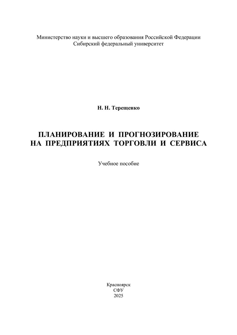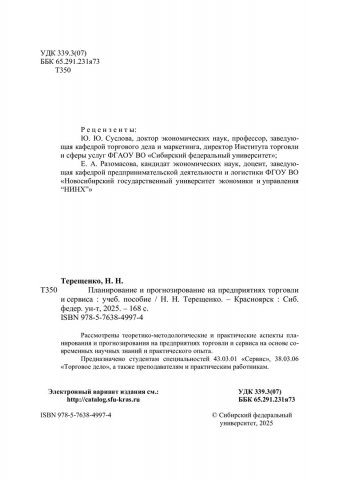 Библиографическое описание: Терещенко, Наталья Николаевна. Планирование и прогнозирование на предприятиях торговли и сервиса : учебное пособие / Н. Н. Терещенко ; рец.: Ю. Ю. Суслова, Е. А. Разомасова ; Сибирский федеральный университет, Институт торговли и сферы услуг. - Электрон. текстовые дан. (pdf ; 2,7 Мб). - Красноярск : СФУ, 2025 (2025-04-02). - 168 с., 10.5 усл. печ. л. : табл. - Загл. с титул. экрана. - Электрон. версия печ. публикации . - Библиогр.: с. 147-150. - 100 экз. - ISBN 978-5-7638-4997-4 : Б. ц. - Изд. № 2024-22050. - Текст : электронный.