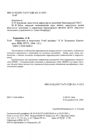 Библиографическое описание: Ходыкина, Лилия Владимировна. Маркетинг в энергетике : учебное пособие / Л. В. Ходыкина ; Краснояр. гос. техн. ун-т. - Красноярск : ИПЦ КГТУ, 2004. - 132 с. : ил. - (Учебное пособие). - Библиогр.: с. 128-130. - ISBN 5-7636-0688-4. - Текст : непосредственный + Текст : электронный.