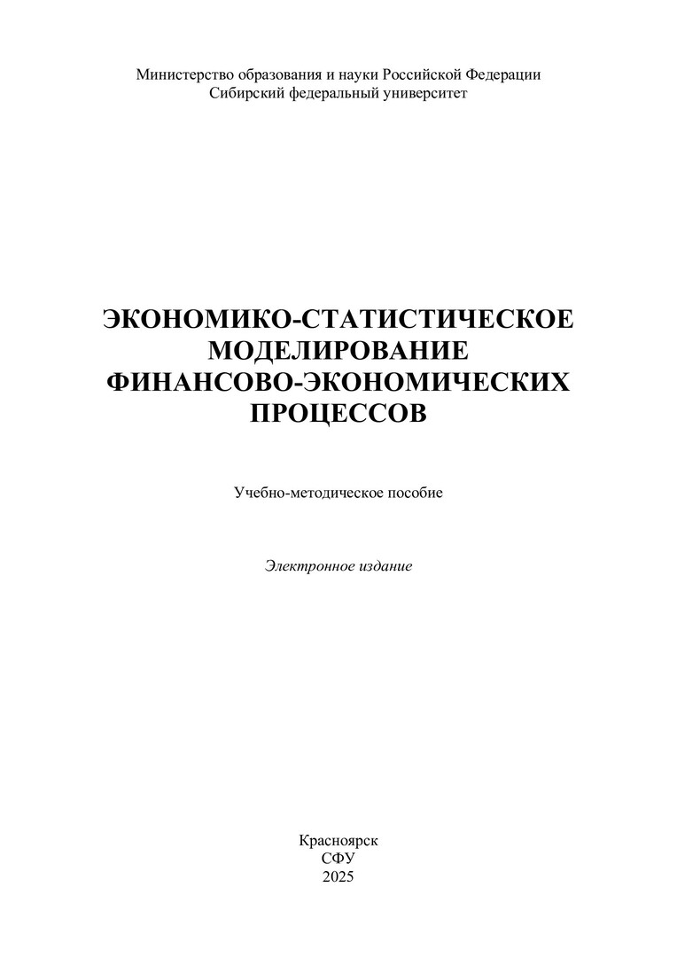 Библиографическое описание:Экономико-статистическое моделирование финансово-экономических процессов : учебно-методическое пособие / Сибирский федеральный университет, Институт управления бизнес-процессами ; сост.: Е. С. Ковзунова, Т. А. Бурменко. - Электрон. текстовые дан. (pdf, 0,4 Мб). - Красноярск : СФУ, 2025. - 14 с. - Загл. с титул. экрана. - Изд. № 2025-24175 : Б. ц. - Текст : электронный.