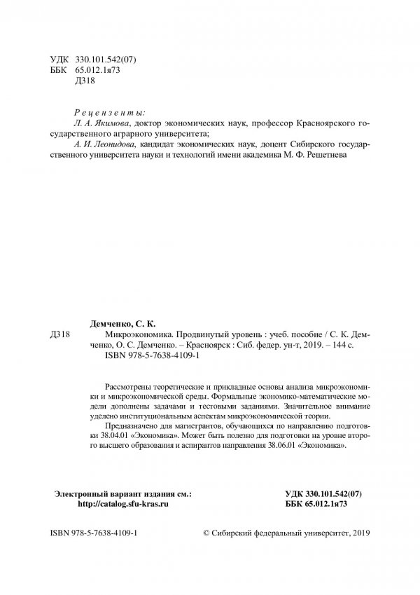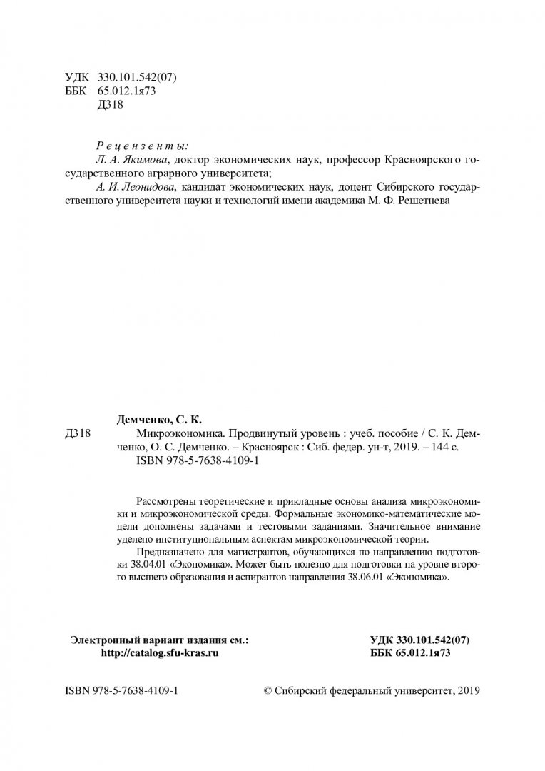Библиографическое описание: Демченко, Светлана Капитоновна. Микроэкономика. Продвинутый уровень : учебное пособие / С. К. Демченко, О. С. Демченко ; Сиб. федер. ун-т, Ин-т торговли и сферы услуг. - Красноярск : СФУ, 2019 (2019-11-25). - 141 с. : рис., табл. - Библиогр.: с. 139-141. - 100 экз. - ISBN 978-5-7638-4109-1 : 274.00 р. - Изд. № 2019-7818. - Текст : непосредственный : электронный.
