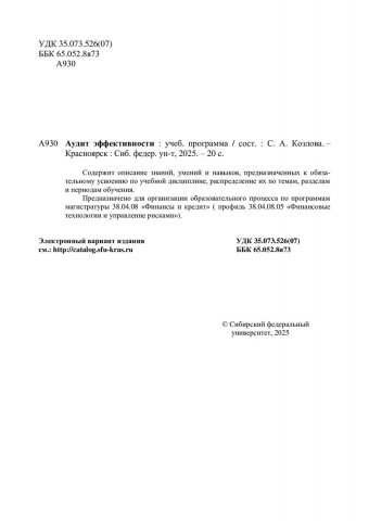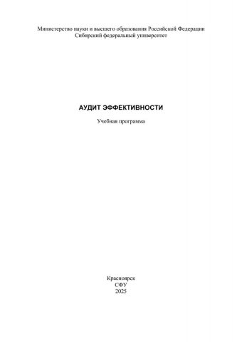 Библиографическое описание:Аудит эффективности : учебная программа / Сибирский федеральный университет ; сост. С. А. Козлова. - Электрон. текстовые дан. (0,8 Мб). - Красноярск : СФУ, 2024 (2025-01-16). - 20 с., 1.0 усл. печ. л. - Загл. с титул. экрана. - Электрон. версия печ. публикации . - 100 экз. - Изд. № 2024-23505 : Б. ц. - Текст : электронный.