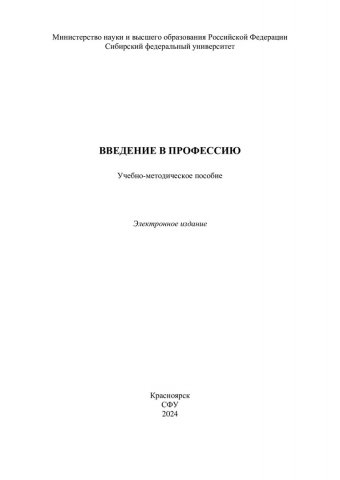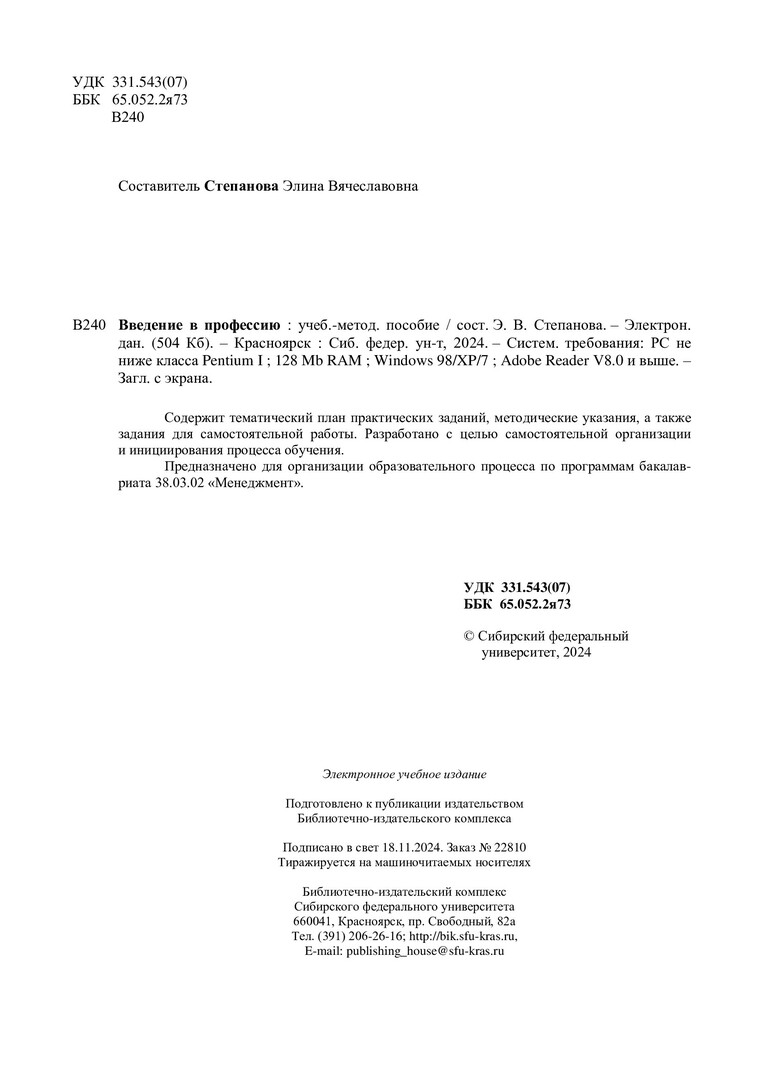 Библиографическое описание: Введение в профессию : учебно-методическое пособие / Сиб. федер. ун-т, Ин-т упр. бизнес-процессами ; сост. Э. В. Степанова. - Электрон. текстовые дан. (pdf, 0,5 Мб). - Красноярск : СФУ, 2024 (2024-11-18). - 32 с. - Загл. с титул. экрана. - Изд. № 2024-22810 : Б. ц. - Текст : электронный.