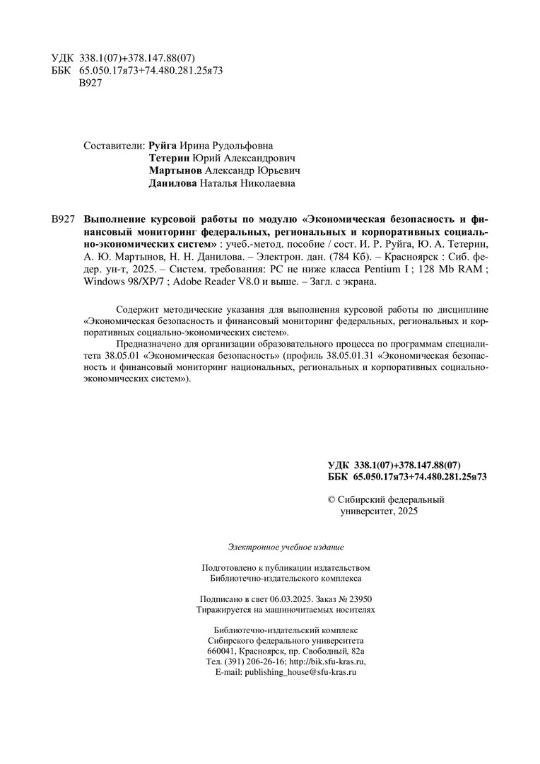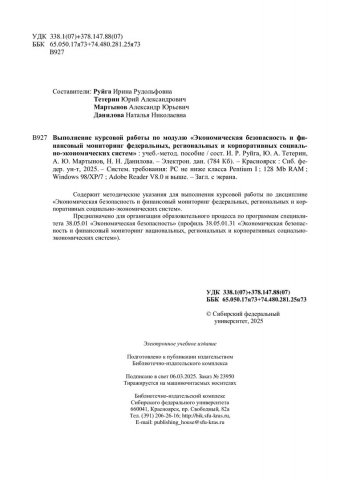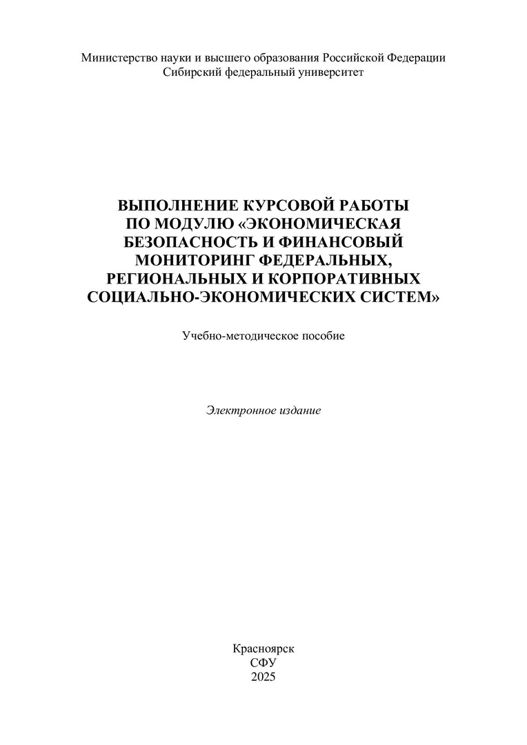 Библиографическое описание:Выполнение курсовой работы по модулю "Экономическая безопасность и финансовый мониторинг федеральных, региональных и корпоративных социально-экономических систем" : учебно-методическое пособие / Сибирский федеральный университет, Институт управления бизнес-процессами ; сост.: И. Р. Руйга, Ю. А. Тетерин, А. Ю. Мартынов, Н. Н. Данилова. - Электрон. текстовые дан. (pdf, 0,8 Мб). - Красноярск : СФУ, 2025 (2025-03-06). - 44 с. - Загл. с титул. экрана. - Библиогр.: с. 32. - Изд. № 2025-23950 : Б. ц. - Текст : электронный.