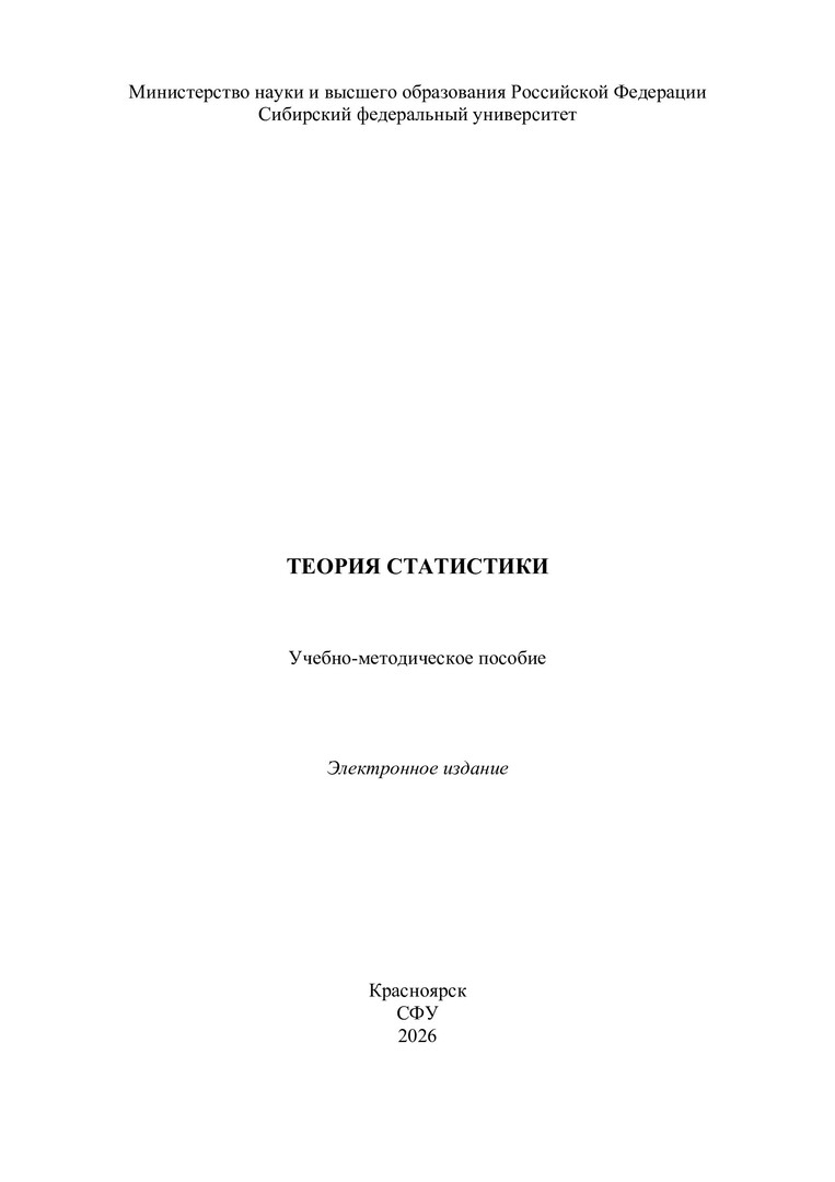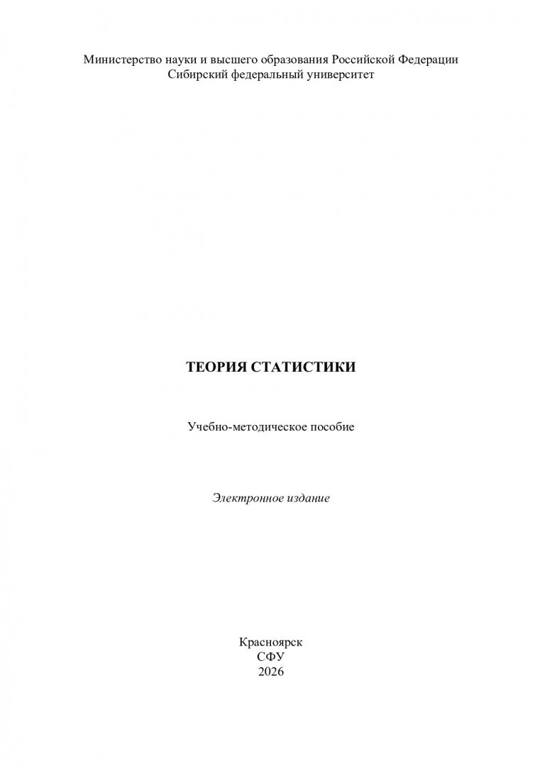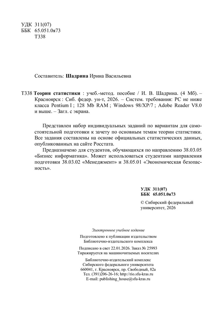 Библиографическое описание: Теория статистики : учебно-методическое пособие / Сибирский федеральный университет, Институт управления бизнес-процессами ; сост. И. В. Шадрина. - Электрон. текстовые дан. (pdf, 7.4 Мб). - Красноярск : СФУ, 2026 (2026-01-22). - 91 с. - Загл. с титул. экрана. - Изд. № 2026-25993 : Б. ц. - Текст : электронный.