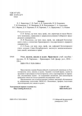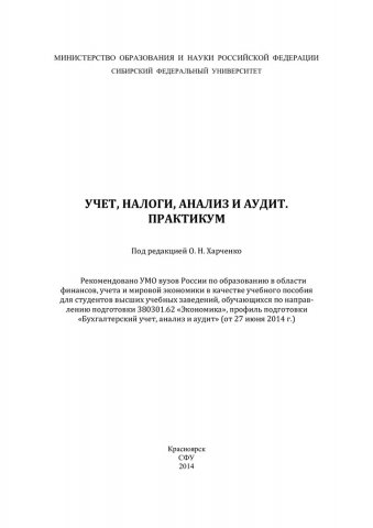 Библиографическое описание: Учет, налоги, анализ и аудит. Практикум : учебное пособие для студентов вузов, Обучающихся по направлению 380301.62 "Экономика", профиль подготовки "Бухгалтерский учет, анализ и аудит" / Е. С. Берестова, С. Н. Гриб [и др.] ; ред. О. Н. Харченко ; Сиб. федер. ун-т, Ин-т экономики, упр. и природопользования. - Красноярск : СФУ, 2014. - 255 с. : табл. - Библиогр.: с. 237-241. - 500 экз. - ISBN 978-5-7638-3088-0 : 257.00 р. - Изд. № 2014-1966. - Текст : непосредственный + Текст : электронный.