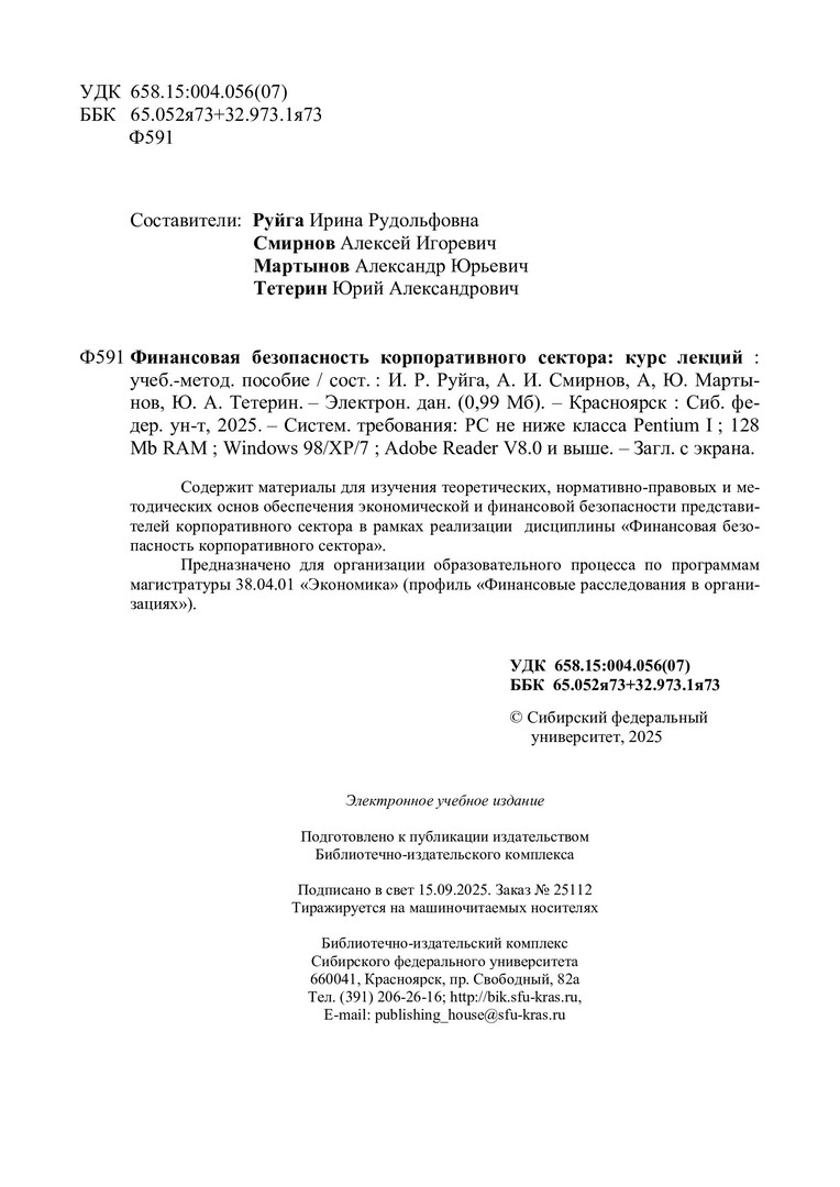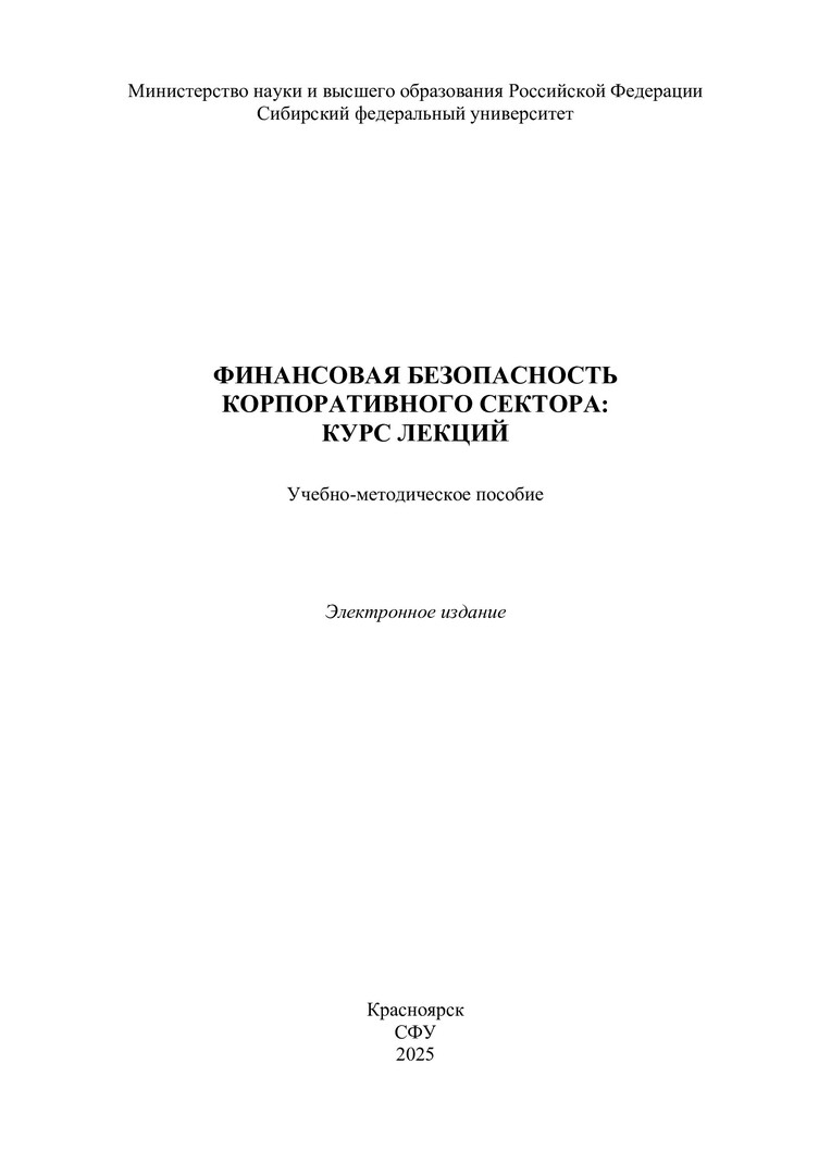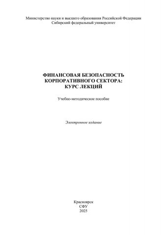 Библиографическое описание: Финансовая безопасность корпоративного сектора: курс лекций : учебно-методическое пособие / Сибирский федеральный университет, Институт управления бизнес-процессами ; сост.: И. Р. Руйга, А. И. Смирнов, А. Ю. Мартынов, Ю. А. Тетерин. - Электрон. текстовые дан. (pdf, 1 Мб). - Красноярск : СФУ, 2025 (2025-09-15). - 123 с. : табл. - Загл. с титул. экрана. - Библиогр.: с. 120-123. - Изд. № 2025-25112 : Б. ц. - Текст : электронный.