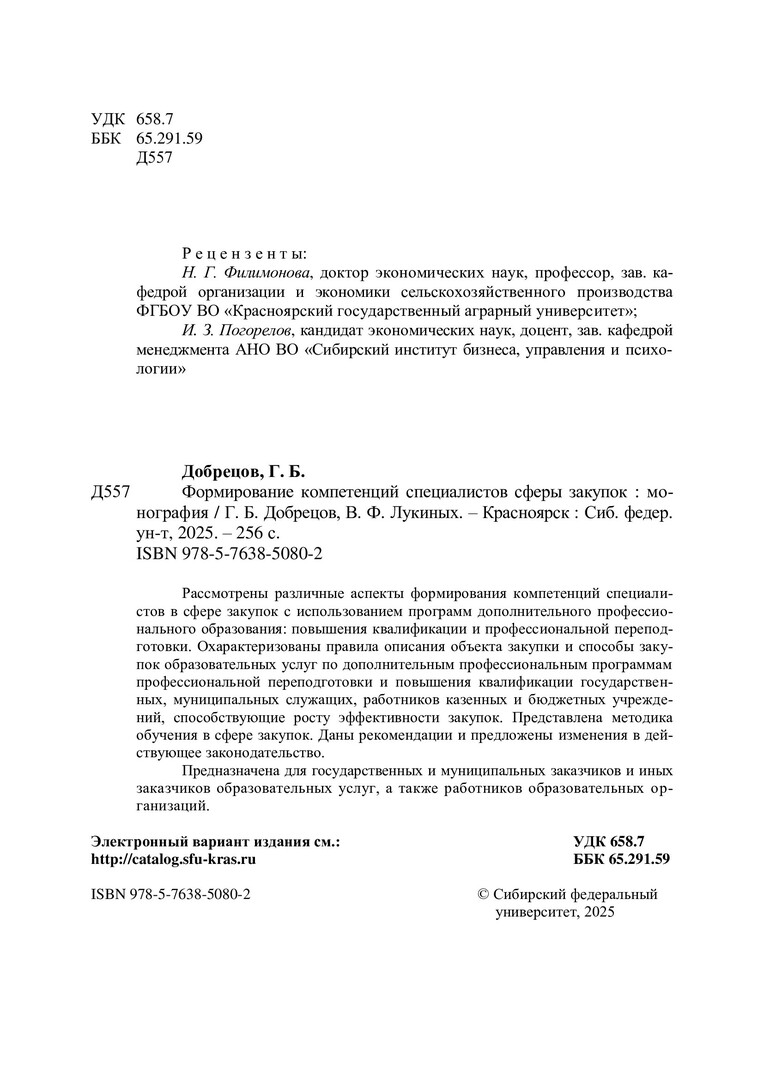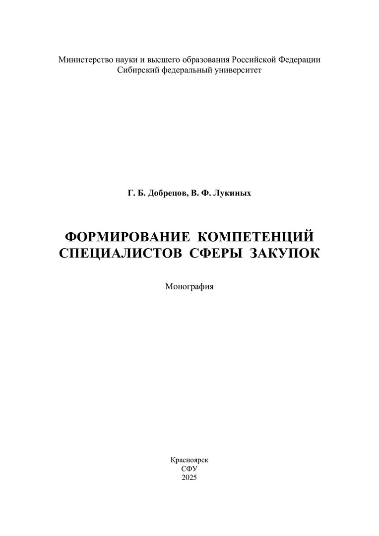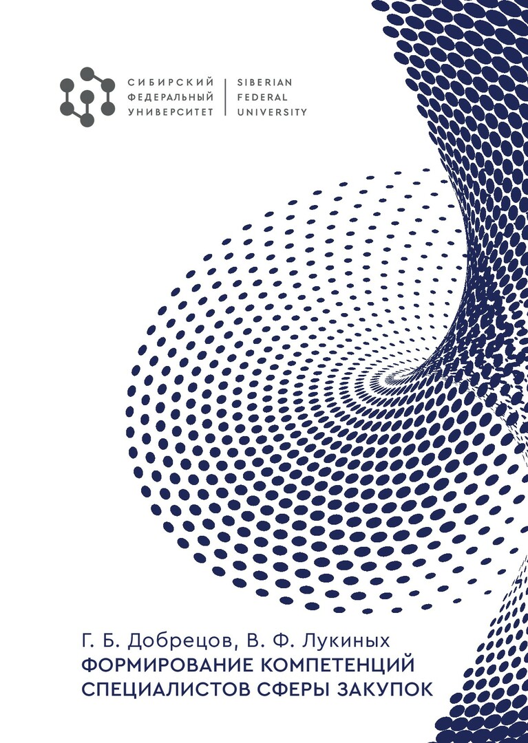 Библиографическое описание: Добрецов, Григорий Борисович. Формирование компетенций специалистов сферы закупок : монография / Г. Б. Добрецов, В. Ф. Лукиных ; [рец.: Н. Г. Филимонова, И. З. Погорелов] ; Сибирский федеральный университет, [Институт торговли и сферы услуг]. - Красноярск : СФУ, 2025 (2025-06-20). - 251 с., 15,75 усл. печ. л. : рис., табл. - Библиогр.: с. 221-228. - 500 экз. - ISBN 978-5-7638-5080-2 : 234.36 р. - Изд. № 2024-23069. - Текст : электронный + Текст : непосредственный.