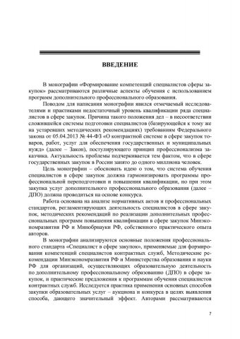 Аннотация: Рассмотрены различные аспекты формирования компетенций специалистов в сфере закупок с использованием программ дополнительного профессионального образования: повышения квалификации и профессиональной переподготовки. Охарактеризованы правила описания объекта закупки и способы закупок образовательных услуг по дополнительным профессиональным программам профессиональной переподготовки и повышения квалификации государственных, муниципальных служащих, работников казенных и бюджетных учреждений, способствующие росту эффективности закупок. Представлена методика обучения в сфере закупок. Даны рекомендации и предложены изменения в действующее законодательство. Предназначена для государственных и муниципальных заказчиков и иных заказчиков образовательных услуг, а также работников образовательных организаций.