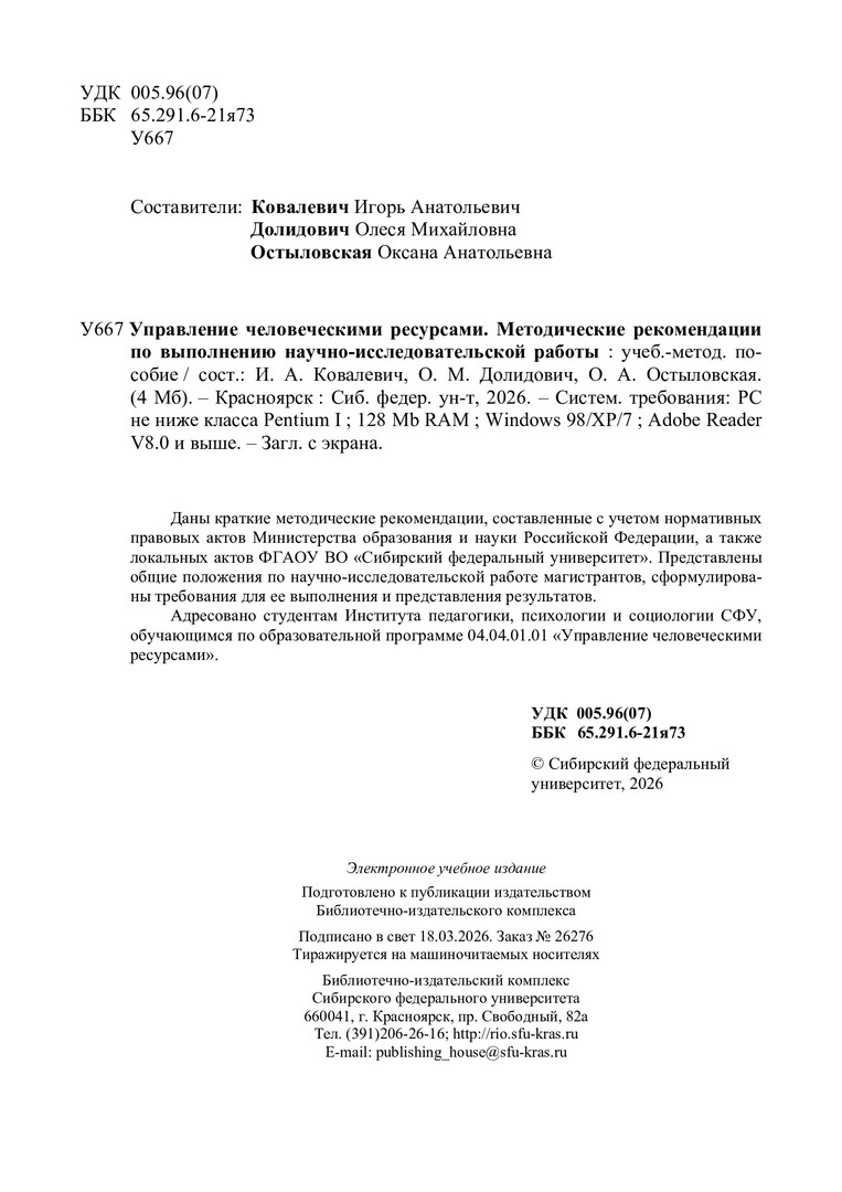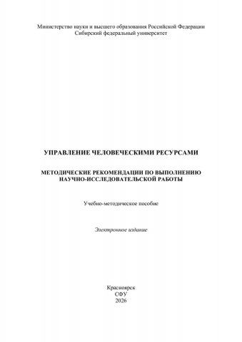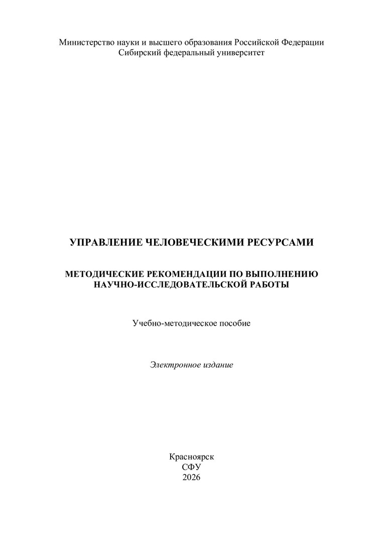 Библиографическое описание:Управление человеческими ресурсами. Методические рекомендации по выполнению научно-исследовательской работы : учебно-методическое пособие / Сиб. федер. ун-т, Ин-т педагогики, психологии и социологии ; сост.: И. А. Ковалевич, О. М. Долидович, О. А. Остыловская. - Электрон. текстовые дан. (pdf, 2.9 Мб). - Красноярск : СФУ, 2026 (2026-03-18). - 62 с. - Загл. с титул. экрана. - Изд. № 2026-26276 : Б. ц. - Текст : электронный.