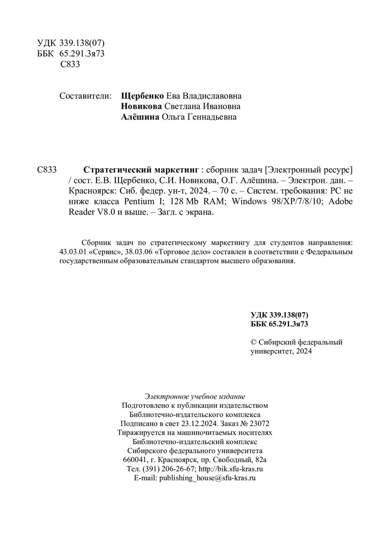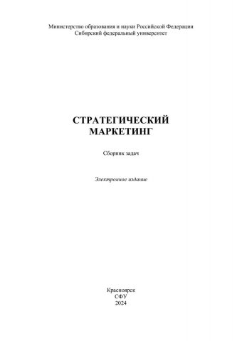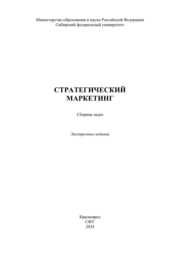 Библиографическое описание:Стратегический маркетинг : сборник задач по стратегическому маркетингу для студентов направления: 43.03.01 «Сервис», 38.03.06 «Торговое дело» / Сибирский федеральный университет, Институт торговли и сферы услуг ; сост.: Е. В. Щербенко, С. И. Новикова, О. Г. Алешина. - Электрон. текстовые дан. (pdf, 1,6 Мб). - Красноярск : СФУ, 2024. - 70 с. - Загл. с титул. экрана. - Библиогр.: с. 65-70. - Изд. № 2024-23072 : Б. ц. - Текст : электронный.