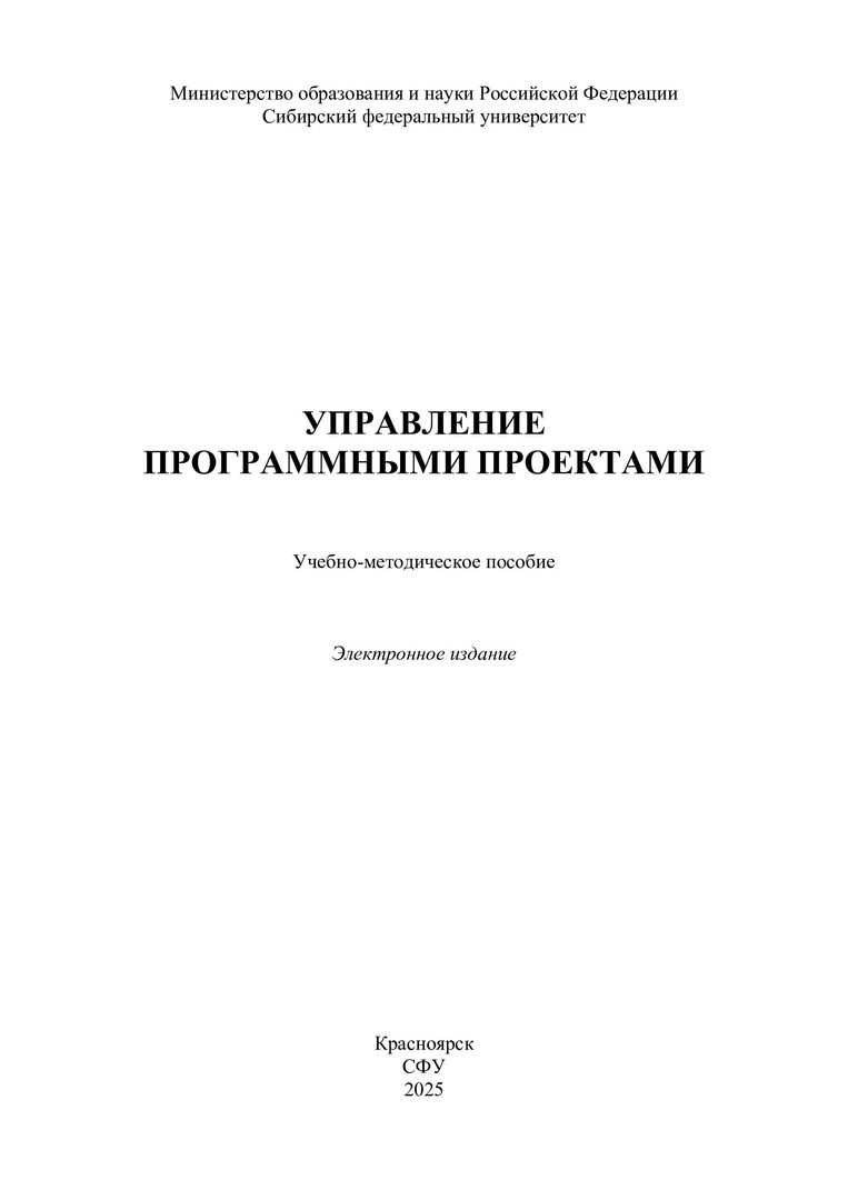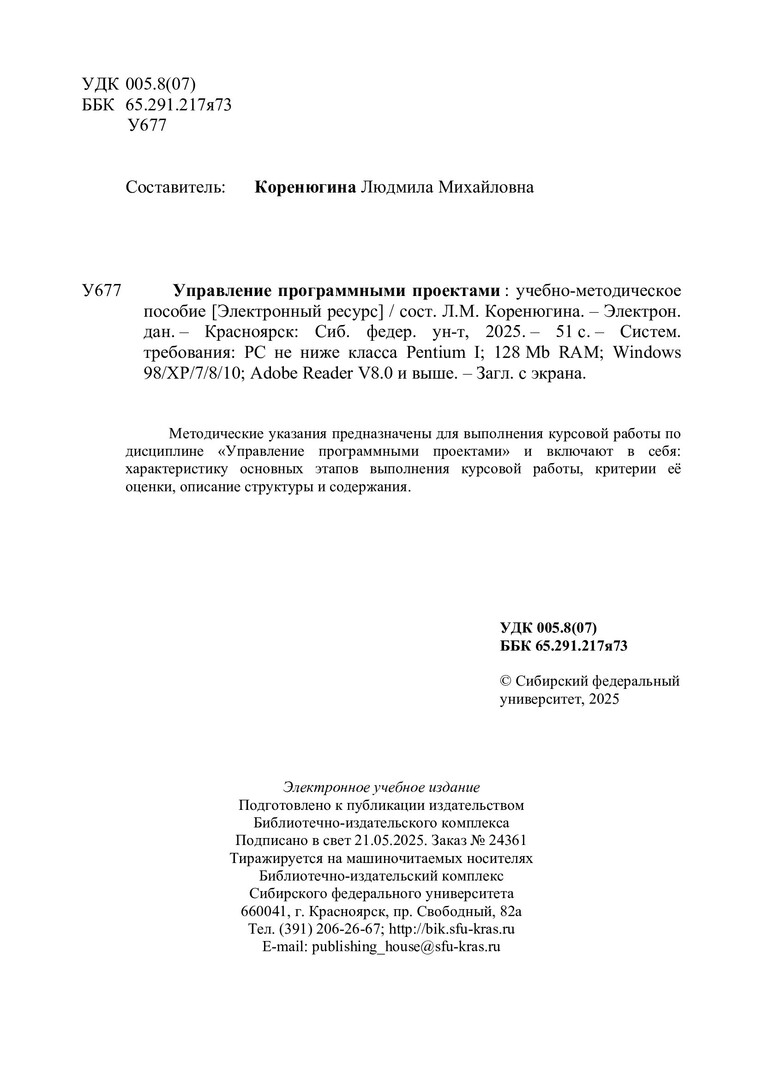 Библиографическое описание:Управление программными проектами : [курсовая работа]: учебно-методическое пособие / Сибирский федеральный университет, Институт космических и информационных технологий ; сост. Л. М. Коренюгина. - Электрон. текстовые дан. (pdf, 1,3 Мб). - Красноярск : СФУ, 2025. - 51 с. : схемы, табл. - Загл. с титул. экрана. - Библиогр.: с. 48-50. - Изд. № 2025-24361 : Б. ц. - Текст : электронный.