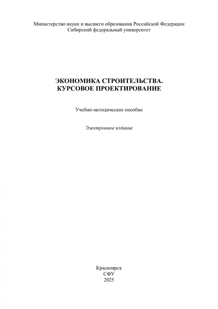 Библиографическое описание: Экономика строительства. Курсовое проектирование : учебно-методическое пособие / Сиб. федер. ун-т, Инж.-строит. ин-т ; сост.: И. А. Саенко, О. Р. Толочко, Н. О. Дмитриева. - Электрон. текстовые дан. (pdf, 1.6 Мб). - Красноярск : СФУ, 2025 (2025-12-05). - 132 с. - Загл. с титул. экрана. - Изд. № 2025-25622 : Б. ц. - Текст : электронный.