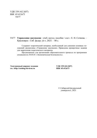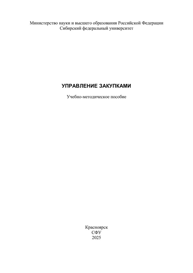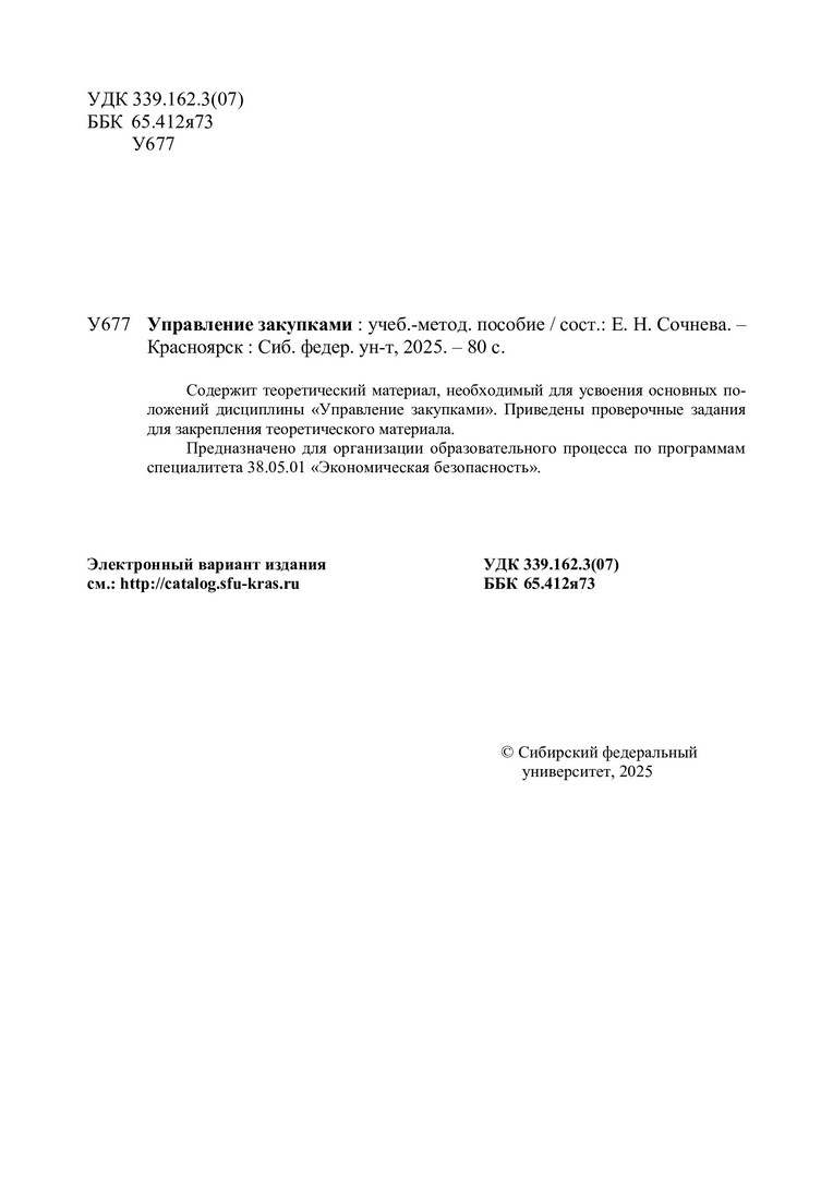 Библиографическое описание: Управление закупками : учебно-методическое пособие / Сибирский федеральный университет ; сост. Е. Н. Сочнева. - Электрон. текстовые дан. (pdf, 0.8 Мб). - Красноярск : СФУ, 2025 (2025-09-01). - 80 с., 4.0 усл. печ. л. - Загл. с титул. экрана. - Электрон. версия печ. публикации . - Библиогр.: с. 78. - 100 экз. - Изд. № 2025-25038 : Б. ц. - Текст : электронный.