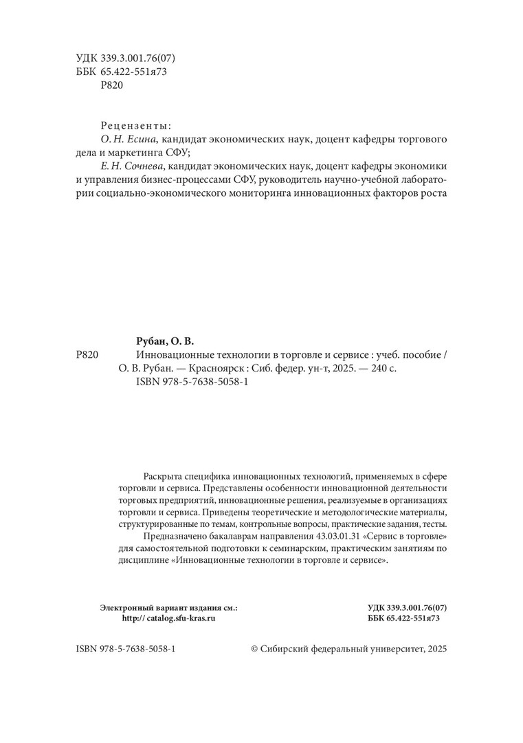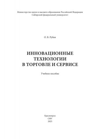 Библиографическое описание: Рубан, Ольга Викторовна. Инновационные технологии в торговле и сервисе : учебное пособие / О. В. Рубан ; рец.: О. Н. Есина, Е. Н. Сочнева ; Сибирский федеральный университет, Институт торговли и сферы услуг. - Электрон. текстовые дан. (pdf ; 4,0 Мб). - Красноярск : СФУ, 2025 (2025-03-03). - 240 с., 15.0 усл. печ. л. - Загл. с титул. экрана. - Электрон. версия печ. публикации . - Библиогр.: с. 225-226. - 100 экз. - ISBN 978-5-7638-5058-1 : Б. ц. - Изд. № 2024-22954. - Текст : электронный.