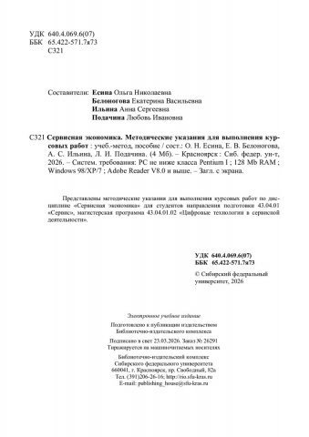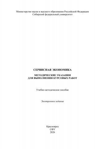Библиографическое описание:Сервисная экономика. Методические указания для выполнения курсовых работ : учебно-методическое пособие / Сиб. федер. ун-т, Ин-т торговли и сферы услуг ; сост. О. Н. Есина [и др.]. - Электрон. текстовые дан. (pdf, 2.7 Мб). - Красноярск : СФУ, 2026 (2026-03-23). - 42 с. - Загл. с титул. экрана. - Изд. № 2026-26291 : Б. ц. - Текст : электронный.