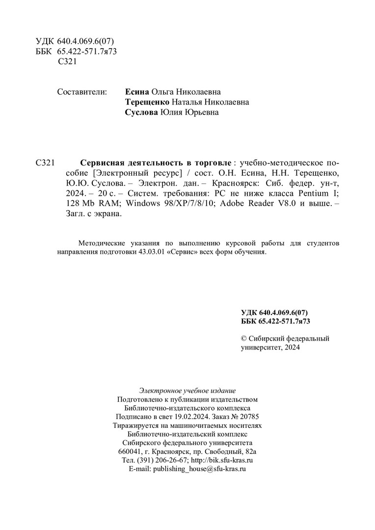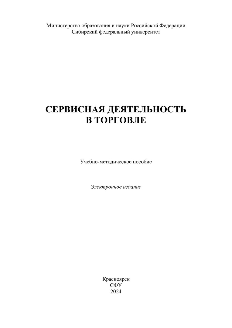Библиографическое описание:Сервисная деятельность в торговле : учебно-методическое пособие / Сиб. федер. ун-т, Ин-т торговли и сферы услуг ; сост.: О. Н. Есина, Н. Н. Терещенко, Ю. Ю. Суслова. - Электрон. текстовые дан. (pdf, 0,5 Мб). - Красноярск : СФУ, 2024 (2024-02-19). - 20 с. - Загл. с титул. экрана. - Изд. № 2023-20785 : Б. ц. - Текст : электронный.