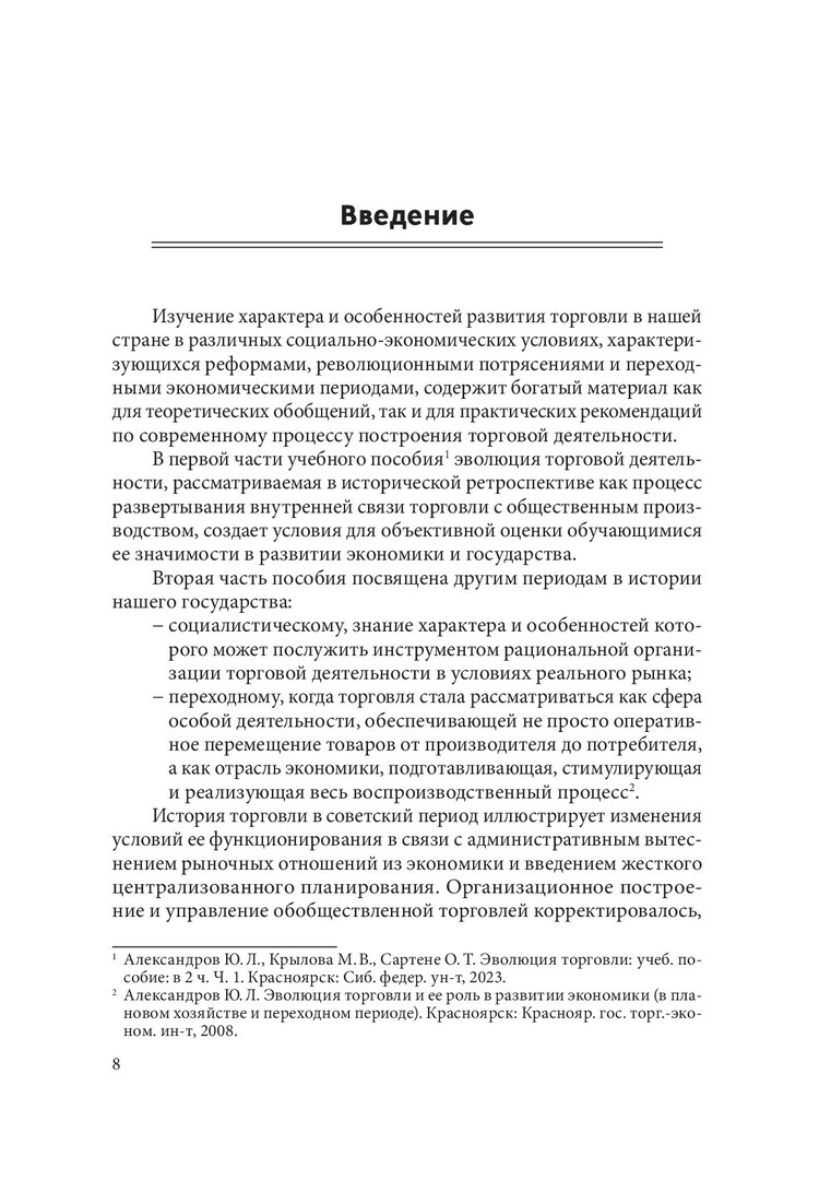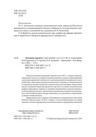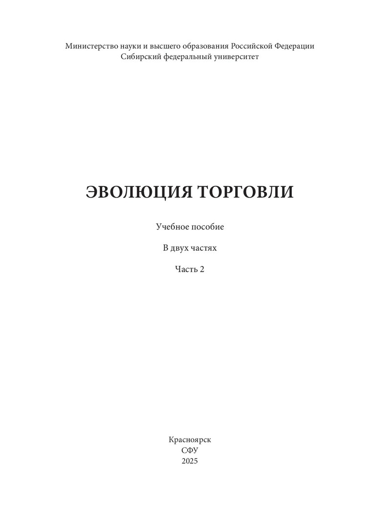 Библиографическое описание: Эволюция торговли : учебное пособие : в 2 частях / Сибирский федеральный университет, [Институт торговли и сферы услуг]. - Красноярск : СФУ, 2023 - 2025. - ISBN 978-5-7638-4651-5 . - Текст : электронный. + Текст : непосредственный. Ч. 2 / Ю. Л. Александров, М. В. Крылова, О. Т. Сартене, Н. В. Ананьева ; [рец.: М. С. Злотников, Е. В. Щербенко]. - Красноярск : СФУ, 2025 (2025-05-07). - 372 с., 23.3 усл. печ. л. : граф., схемы, табл. - Авт. указаны на обороте тит. л. - Библиогр.: с. 325-334. - 100 экз. - ISBN 978-5-7638-4891-5 : 345.96 р. - Изд. № 2023-20114