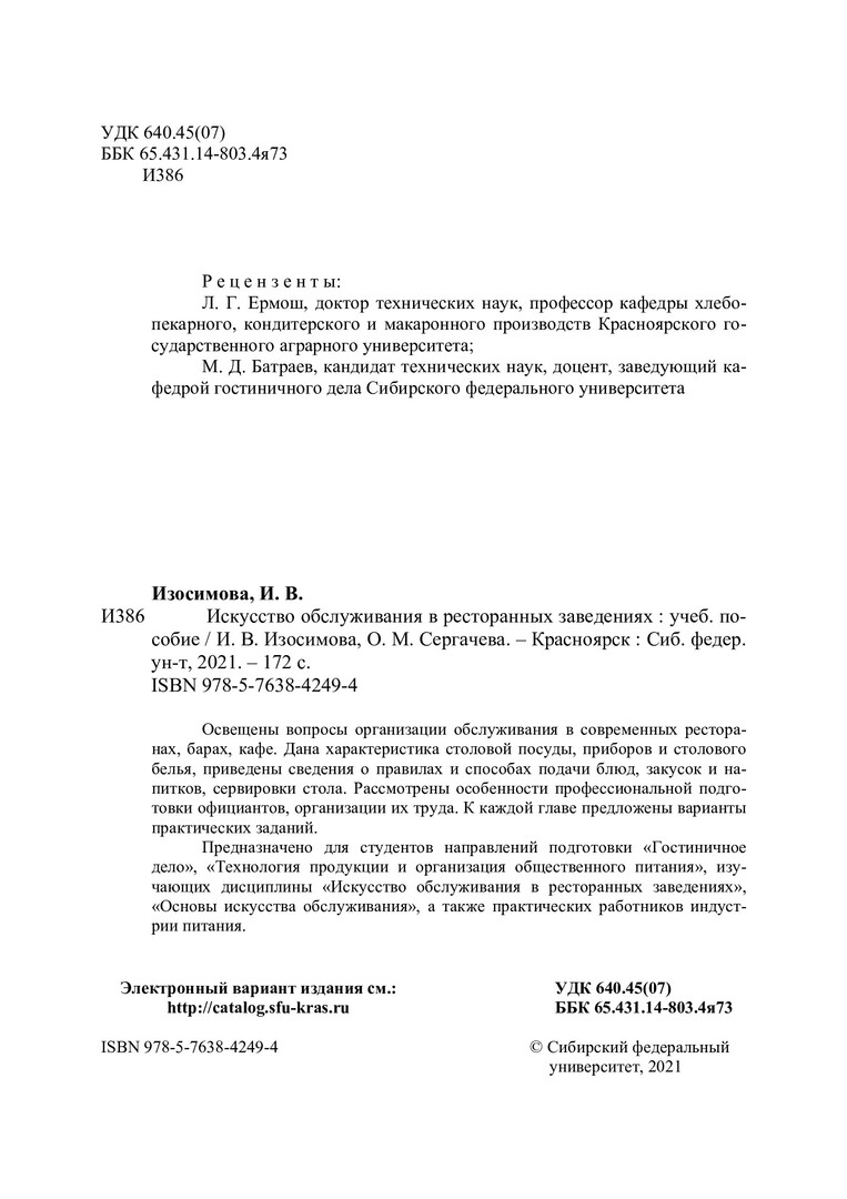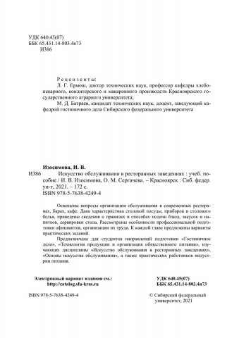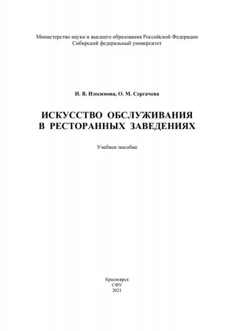 Библиографическое описание: Изосимова, Ирина Владимировна. Искусство обслуживания в ресторанных заведениях : учебное пособие / И. В. Изосимова, О. М. Сергачева ; Сибирский федеральный университет, Институт торговли и сферы услуг. - Красноярск : СФУ, 2021 (2021-03-19). - 172 с., 10.8 усл. печ. л. : цв. ил. - Библиогр.: с. 107-108. - 100 экз. - ISBN 978-5-7638-4249-4 : 550.00 р. - Изд. № 2019-10220. - Текст : непосредственный : электронный.
