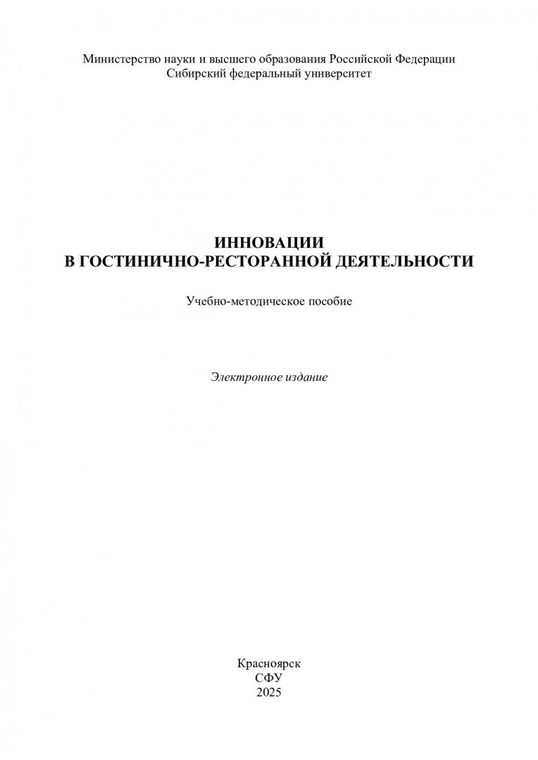 Библиографическое описание:Инновации в гостинично-ресторанной деятельности : учебно-методическое пособие / Сибирский федеральный университет, Институт торговли и сферы услуг ; сост. Т. Н. Сафронова. - Электрон. текстовые дан. (pdf, 1.7 Мб). - Красноярск : СФУ, 2025 (2025-10-06). - 109 с. : табл. - Загл. с титул. экрана. - Библиогр.: с. 104-109. - Изд. № 2025-25190 : Б. ц. - Текст : электронный.