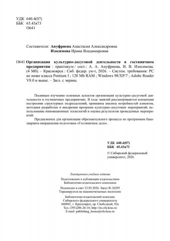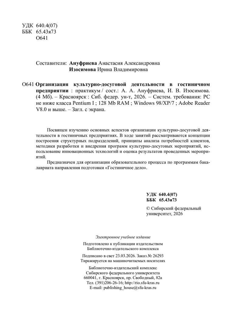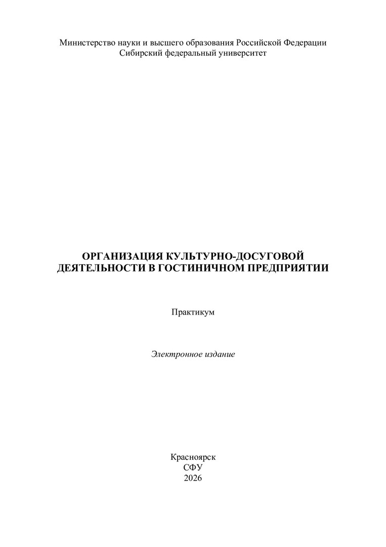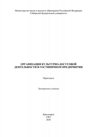 Библиографическое описание:Организация культурно-досуговой деятельности в гостиничном предприятии : практикум : учебно-методическое пособие / Сибирский федеральный университет, Институт торговли и сферы услуг ; сост.: А. А. Ануфриева, И. В. Изосимова. - Электрон. текстовые дан. (pdf, 2.2 Мб). - Красноярск : СФУ, 2026 (2026-03-23). - 36 с. : табл. - Загл. с титул. экрана. - Библиогр.: с. 35-36. - Изд. № 2026-26293 : Б. ц. - Текст : электронный.