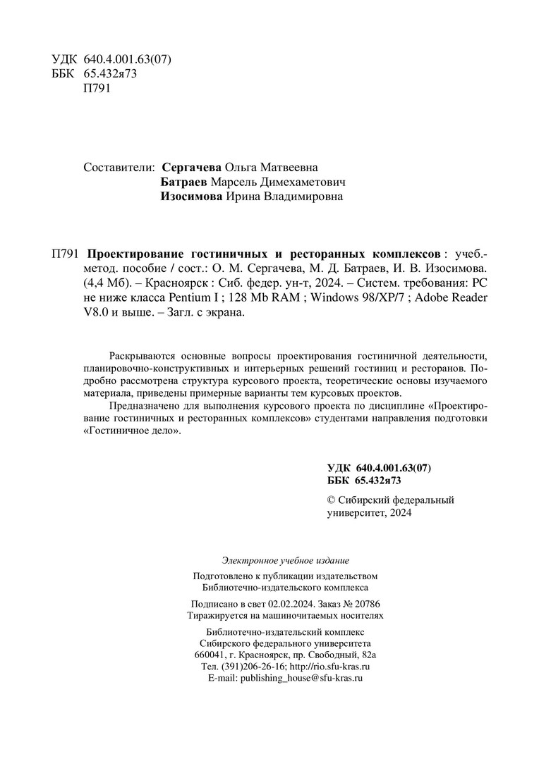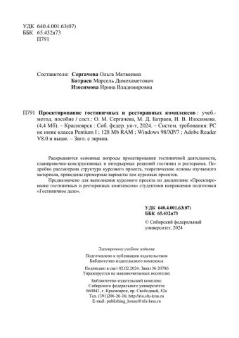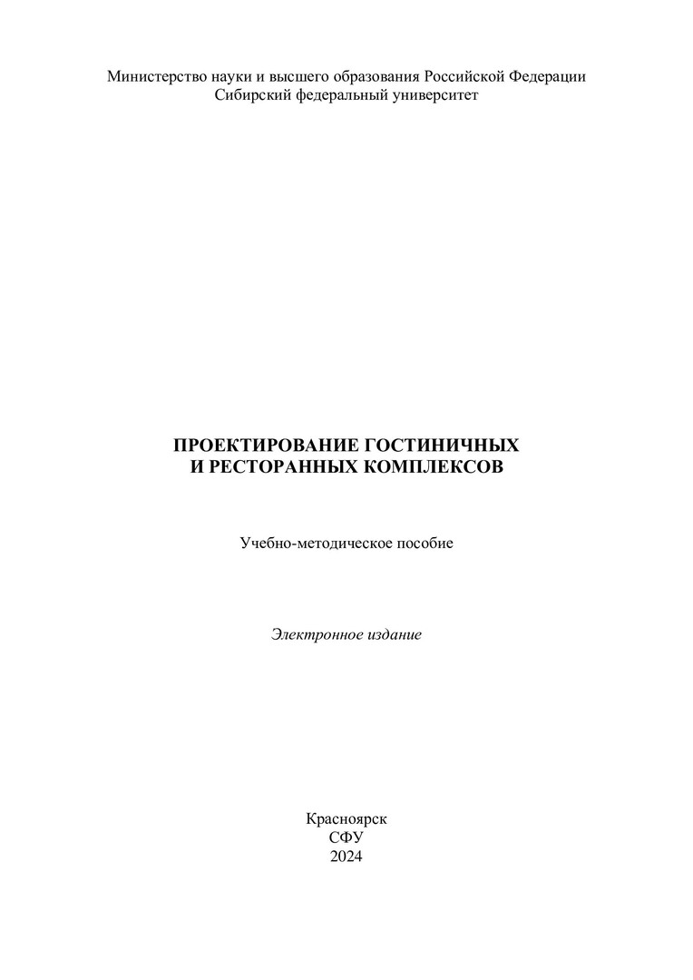 Библиографическое описание: Проектирование гостиничных и ресторанных комплексов : учебно-методическое пособие / Сиб. федер. ун-т, Ин-т торговли и сферы услуг ; сост.: О. М. Сергачева, М. Д. Батраев, И. В. Изосимова. - Электрон. текстовые дан. (pdf, 4,4 Мб). - Красноярск : СФУ, 2024 (2024-02-02). - 88 с. - Загл. с титул. экрана. - Изд. № 2023-20786 : Б. ц. - Текст : электронный.