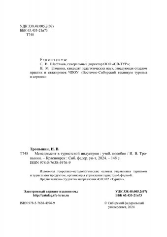 Библиографическое описание: Тропынин, Игорь Витальевич. Менеджмент в туристской индустрии : учебное пособие / И. В. Тропынин ; рец.: С. В. Шестаков, Н. М. Егошина ; Сибирский федеральный университет, Институт физической культуры, спорта и туризма. - Электрон. текстовые дан. (1,3 Мб). - Красноярск : СФУ, 2024 (2024-12-04). - 148 с., 9.3 усл. печ. л. : рис., табл. - Загл. с титул. экрана. - Электрон. версия печ. публикации . - Библиогр.: с. 141-145. - 100 экз. - ISBN 978-5-7638-4976-9 : Б. ц. - Изд. № 2024-21665. - Текст : электронный.