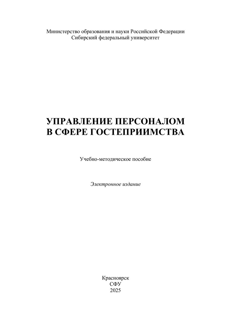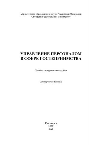 Библиографическое описание: Управление персоналом в сфере гостеприимства : учебно-методическое пособие / Сибирский федеральный университет, Институт торговли и сферы услуг ; сост.: О. А. Яброва, В. С. Филиппова. - Электрон. текстовые дан. (pdf, 1,3 Мб). - Красноярск : СФУ, 2025. - 105 с. - Загл. с титул. экрана. - Библиогр.: с. 102-106. - Изд. № 2025-24662 : Б. ц. - Текст : электронный.