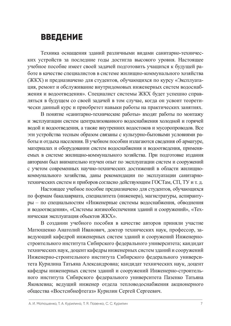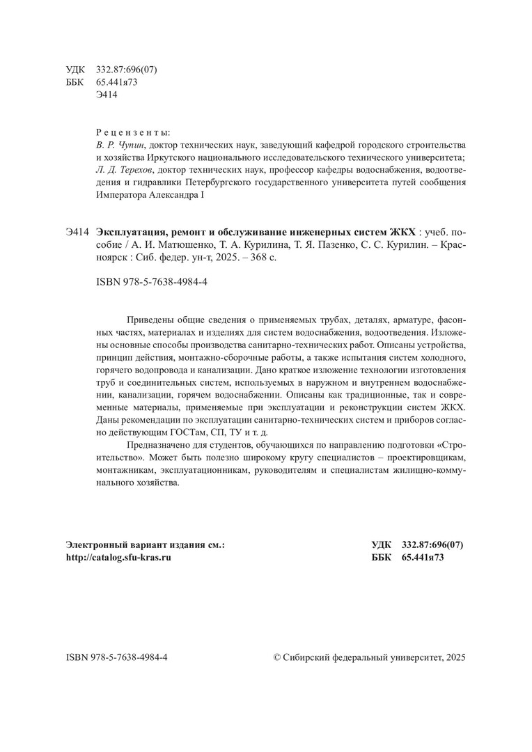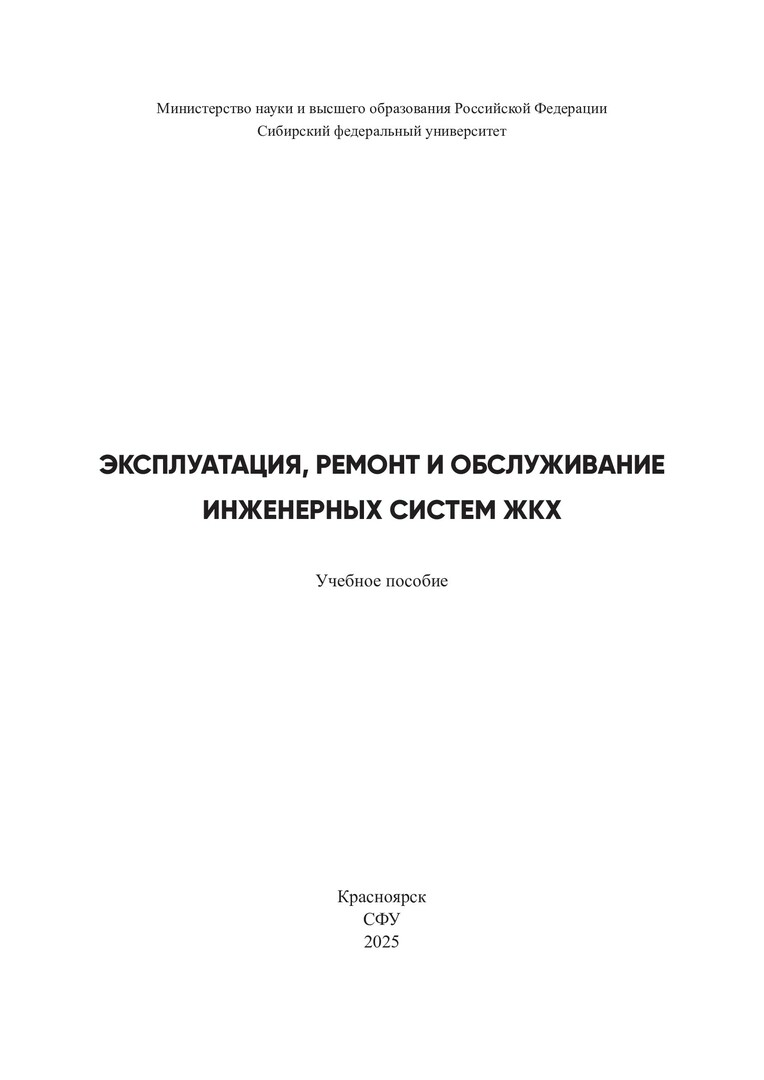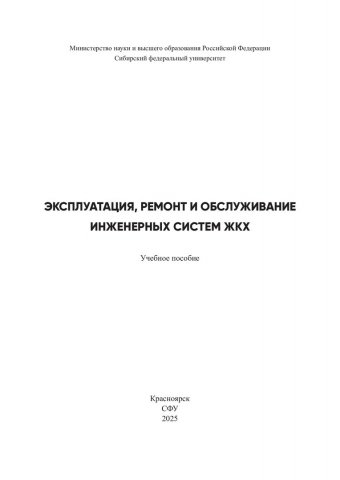 Библиографическое описание: Эксплуатация, ремонт и обслуживание инженерных систем ЖКХ : учебное пособие / А. И. Матюшенко, Т. А. Курилина, Т. Я. Пазенко, С. С. Курилин ; рец.: В. Р. Чупин, Л. Д. Терехов ; Сибирский федеральный университет, Политехнический институт. - Электрон. текстовые дан. (43,8 Мб). - Красноярск : СФУ, 2025 (2025-01-09). - 368 с., 23.0 усл. печ. л. : ил., цв. ил., табл. - Загл. с титул. экрана. - Электрон. версия печ. публикации . - Библиогр.: с. 349-353. - 100 экз. - ISBN 978-5-7638-4984-4 : Б. ц. - Изд. № 2024-21474. - Текст : электронный.