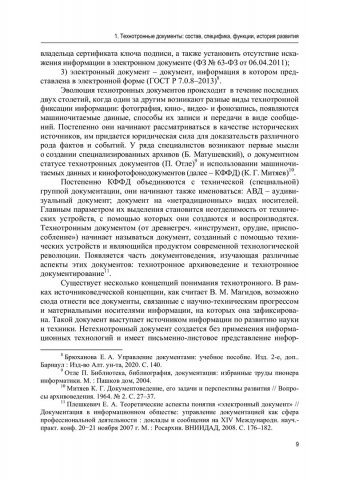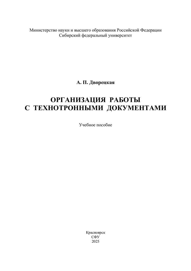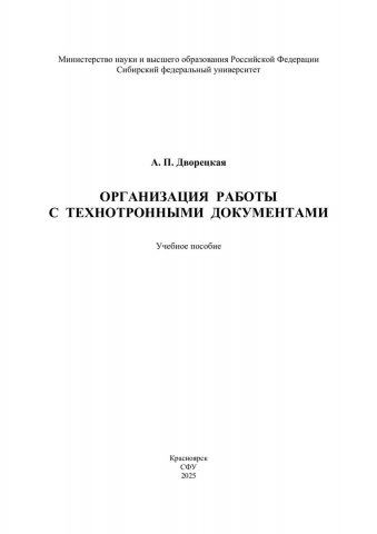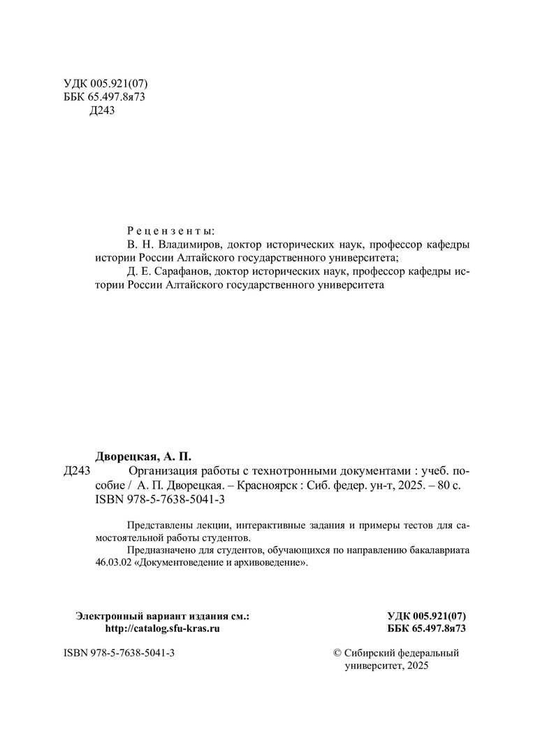 Библиографическое описание: Дворецкая, Анна Павловна. Организация работы с технотронными документами : учебное пособие / А. П. Дворецкая ; рец.: В. Н. Владимиров, Д. Е. Сарафанов ; Сибирский федеральный университет, Гуманитарный институт. - Электрон. текстовые дан. (pdf, 1,5 Мб). - Красноярск : СФУ, 2025 (2025-06-25). - 80 с., 5.0 усл. печ. л. : табл., рис. - Загл. с титул. экрана. - Электрон. версия печ. публикации . - Библиогр.: с. 61-67. - 100 экз. - ISBN 978-5-7638-5041-3 : Б. ц. - Изд. № 2024-22604. - Текст : электронный.