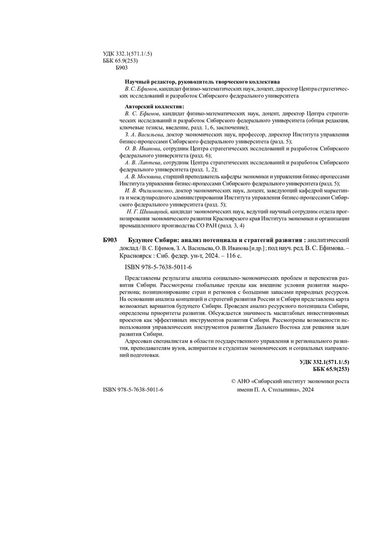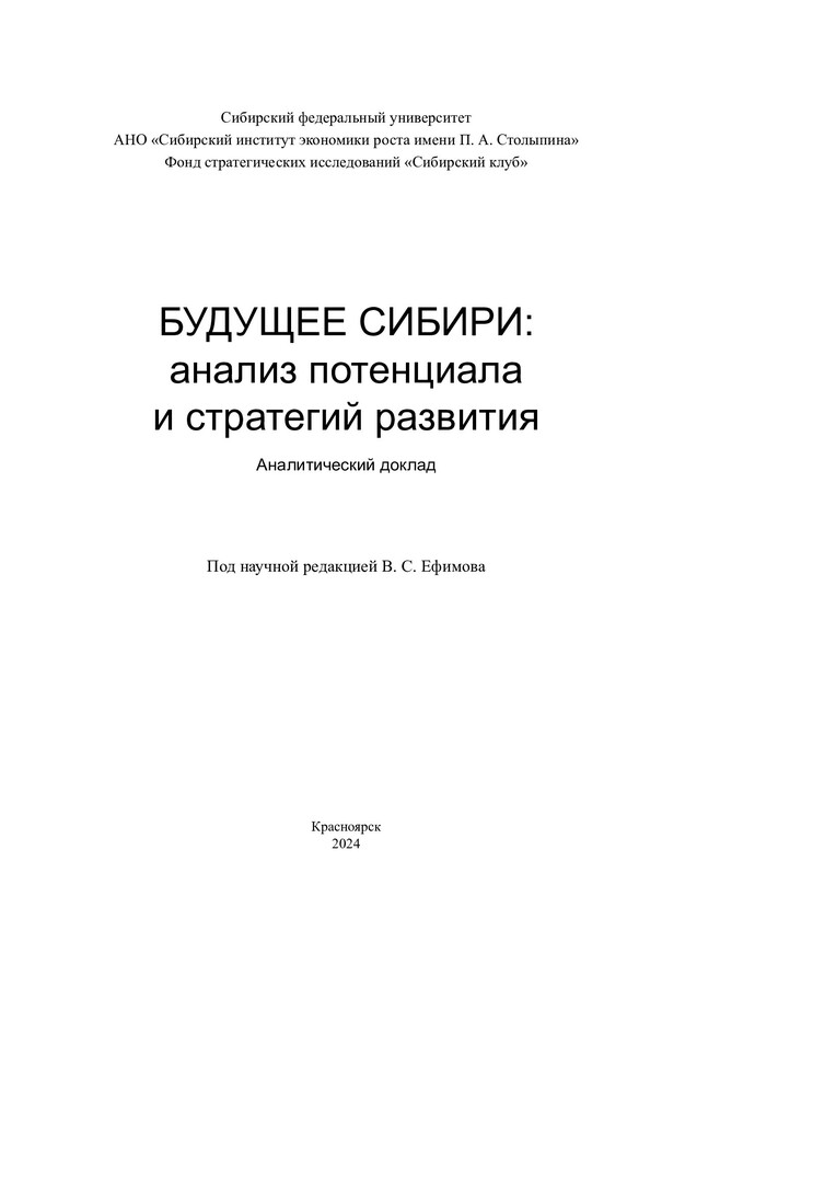 Библиографическое описание: Будущее Сибири: анализ потенциала и стратегий развития : аналитический доклад / В. С. Ефимов, З. А. Васильева, О. В. Иванова [и др.] ; науч. ред. В. С. Ефимов ; Сибирский федеральный университет, АНО «Сибирский институт экономики роста им. П. А. Столыпина», Фонд стратегических исследований «Сибирский клуб». - Электрон. текстовые дан. (pdf, 22 Мб). - Красноярск : СФУ, 2024 (2024-07-22). - 116 с. - Загл. с титул. экрана. - Электрон. версия печ. публикации . - Библиогр.: с. 111-114. - 100 экз. - ISBN 978-5-7638-5011-6 : Б. ц. - Текст : электронный.