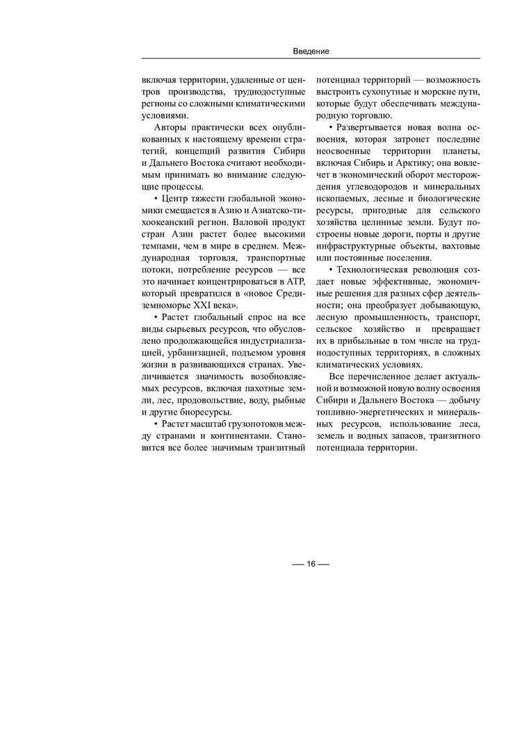 Аннотация: Представлены результаты анализа социально-экономических проблем и перспектив развития Сибири. Рассмотрены глобальные тренды как внешние условия развития макрорегиона; позиционирование стран и регионов с большими запасами природных ресурсов. На основании анализа концепций и стратегий развития России и Сибири представлена карта возможных вариантов будущего Сибири. Проведен анализ ресурсного потенциала Сибири, определены приоритеты развития. Обсуждается значимость масштабных инвестиционных проектов как эффективных инструментов развития Сибири. Рассмотрены возможности использования управленческих инструментов развития Дальнего Востока для решения задач развития Сибири. Адресован специалистам в области государственного управления и регионального развития, преподавателям вузов, аспирантам и студентам экономических и социальных направлений подготовки.
