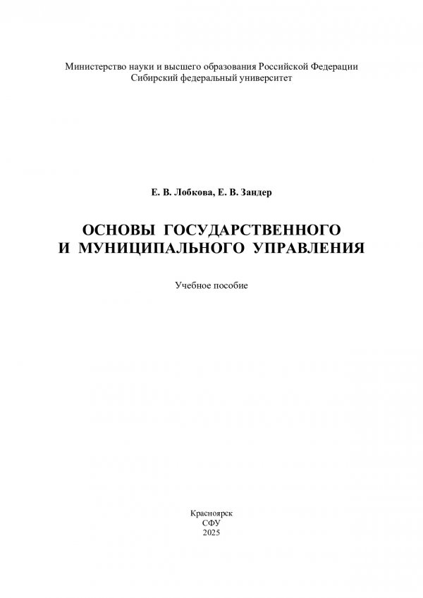 Библиографическое описание: Лобкова, Елена Валерьевна. Основы государственного и муниципального управления : учебное пособие / Е. В. Лобкова, Е. В. Зандер ; рец.: В. Б. Зотов, А. С. Воронов ; Сибирский федеральный университет, Институт экономики, государственного управления и финансов. - Электрон. текстовые дан. (pdf, 1.6 Мб). - Красноярск : СФУ, 2025 (2025-10-15). - 168 с., 10.5 усл. печ. л. - Загл. с титул. экрана. - Электрон. версия печ. публикации . - Библиогр.: с. 165-166. - 100 экз. - ISBN 978-5-7638-5102-1 : Б. ц. - Изд. № 2025-23841. - Текст : электронный.