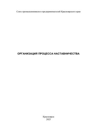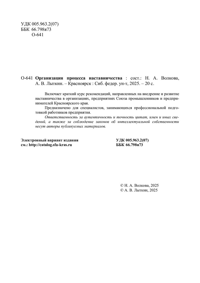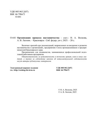 Библиографическое описание: Организация процесса наставничества : учебно-методическое пособие / Союз промышленников и предпринимателей Красноярского края ; сост.: Н. А. Волкова, А. В. Лыткин. - Электрон. текстовые дан. (pdf, 1.1 Мб). - Красноярск : СФУ, 2025 (2025-10-08). - 20 с., 1.0 усл. печ. л. : схемы, табл. - Загл. с титул. экрана. - Электрон. версия печ. публикации . - 100 экз. - Изд. № 2025-25278 : Б. ц. - Текст : электронный.