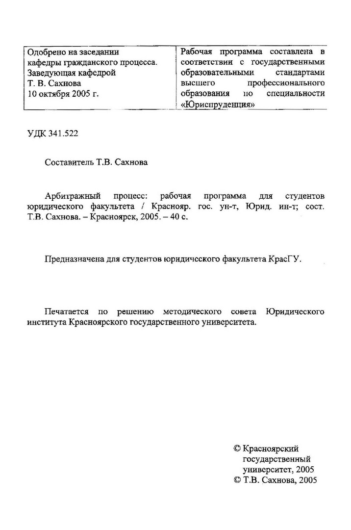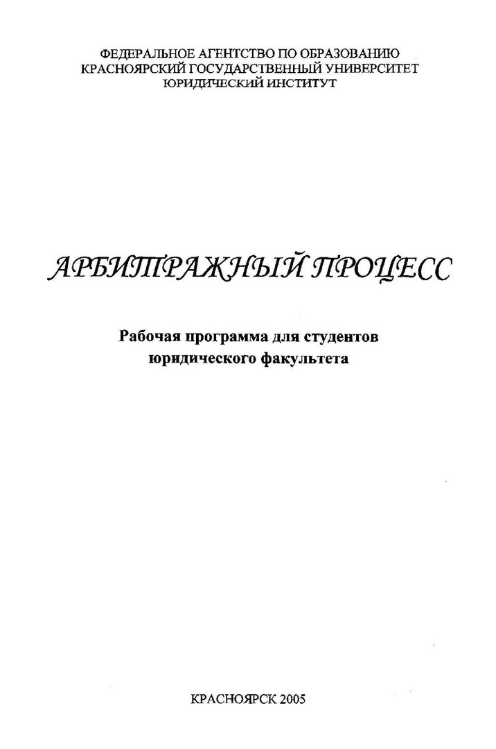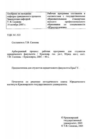 Библиографическое описание:Арбитражный процесс : рабочая программа для студентов юрид. фак. / Краснояр. гос. ун-т. Юрид. ин-т ; сост. Т. В. Сахнова. - Электрон. текстовые дан. - Красноярск : ИЦ КрасГУ, 2005. - (Электронная библиотека СФУ). - Загл. с титул. экрана. - Текст : электронный.